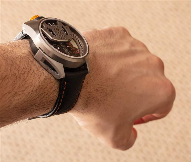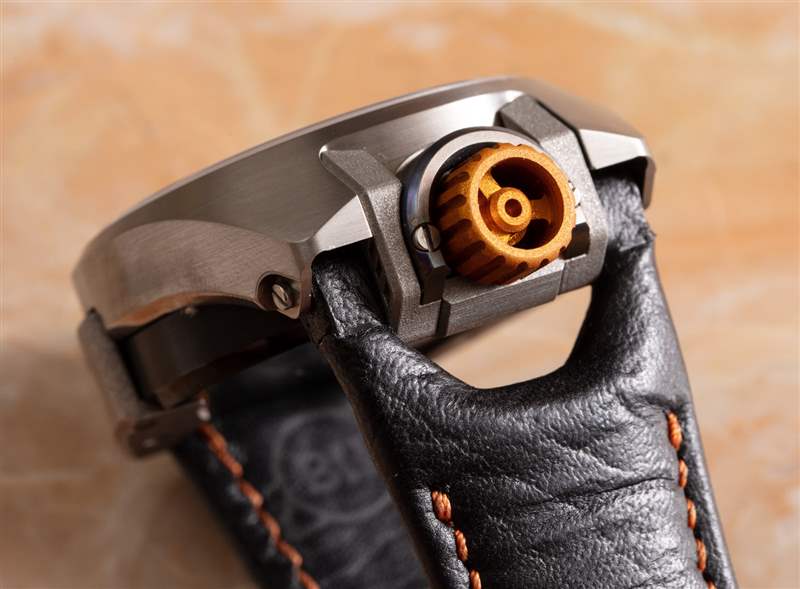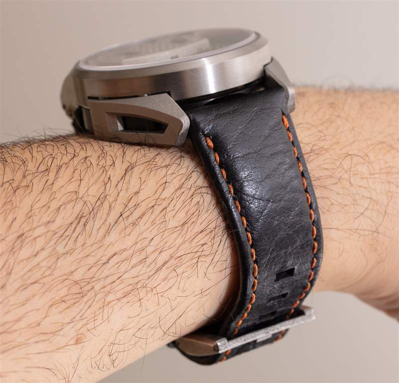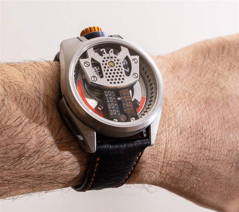 在手腕上,Project 1 有一個簡潔的、類似宇宙飛船的設計。附在表殼上的是手工縫制的美洲野牛皮革表帶。Project 1 手表不會贏得任何選美比賽,但它確實感覺像是一臺真正有趣且以設計為中心的機器。Barrelhand 在獨創(chuàng)性、執(zhí)行力和機械復雜性方面獲得高分。如果手表消費者給巴尚先生的工作一個機會,那么他們不僅會欣賞 Barrelhand Project 1 時計所取得的成就,而且我認為像這樣的頭腦可以很容易地繼續(xù)做更多類型的事情來激發(fā)手表愛好者的幻想。