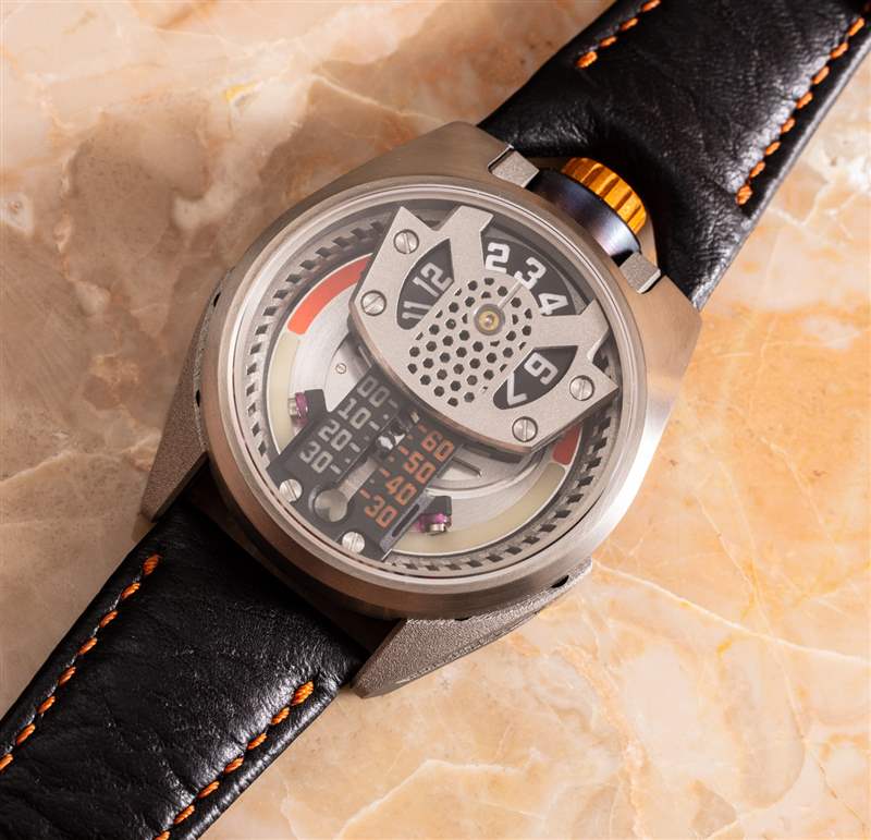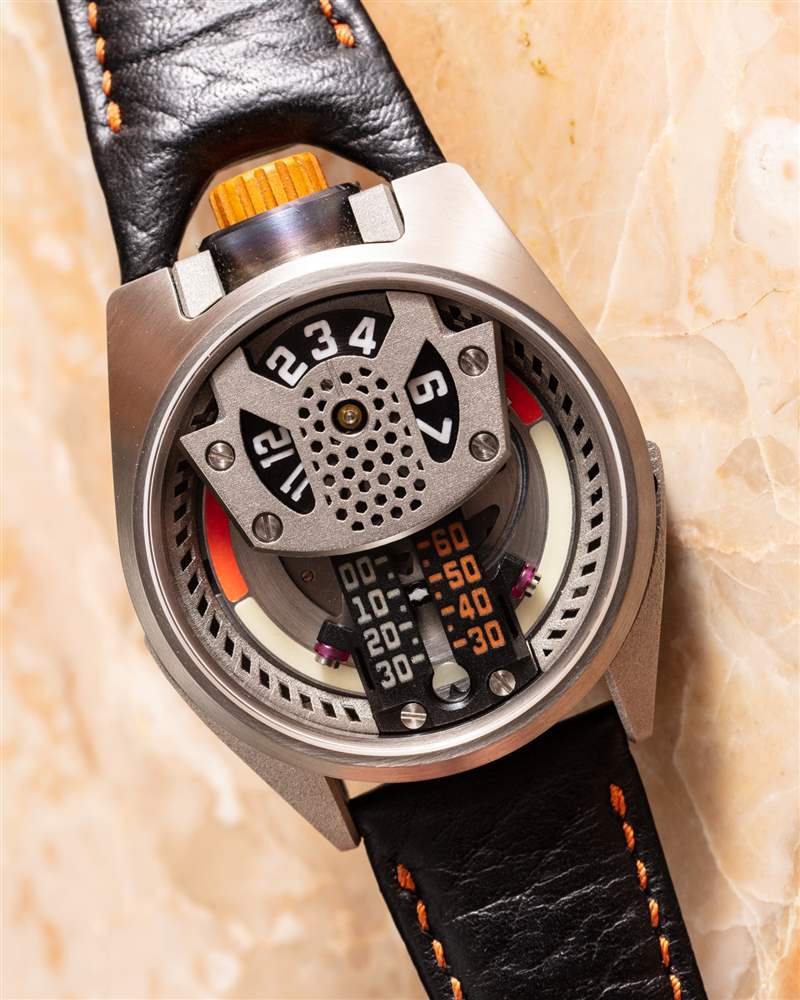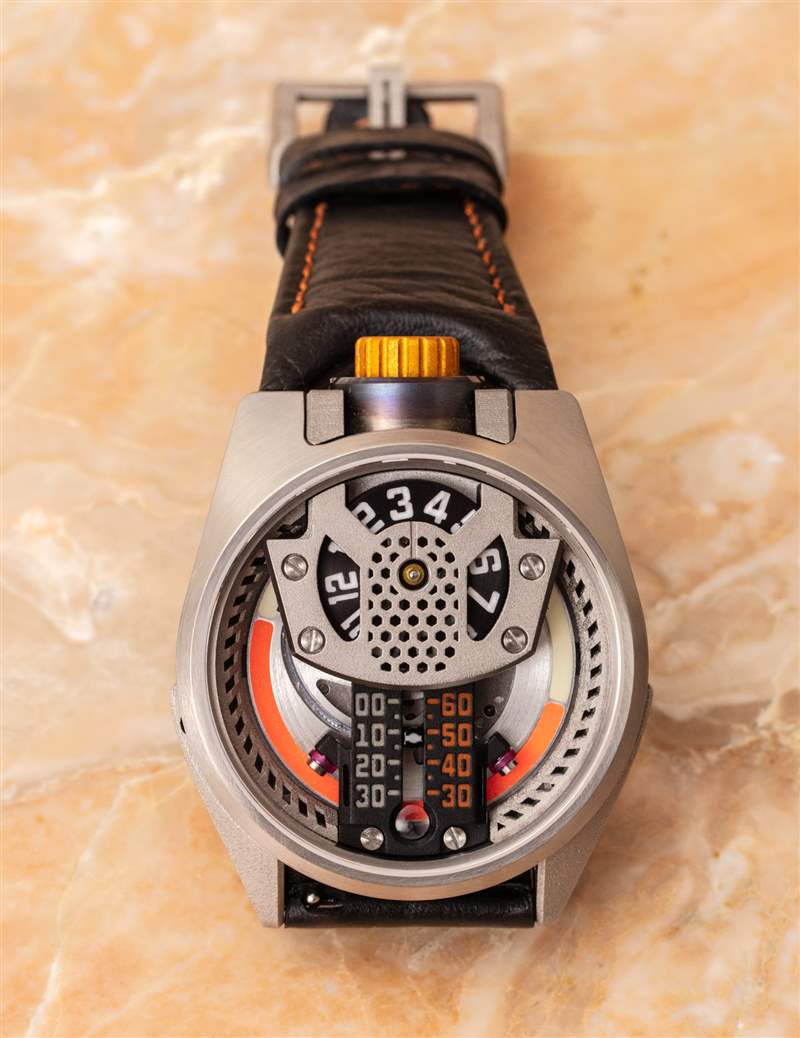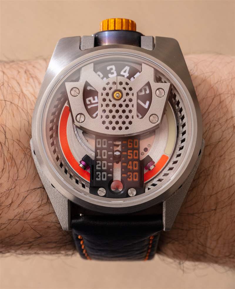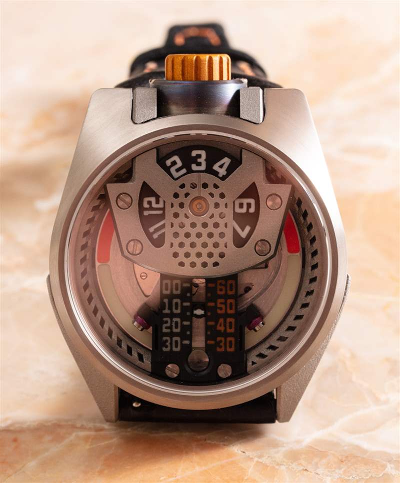 Jumping 小時盤可能不像某些高端瑞士手表那樣從一個小時過渡到另一個小時的平滑和彈性,但 Barrelhand 在這個系統(tǒng)中進行設計非常棒,因為否則,小時環(huán)將具有所謂的“徘徊時間”,這意味著當前時間永遠不會真正成為焦點。就是這樣,但是窗口下方的小線標記旨在描繪眼睛在哪里讀取當前時間可能會受益于更加顯眼。