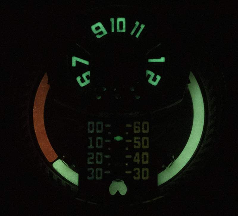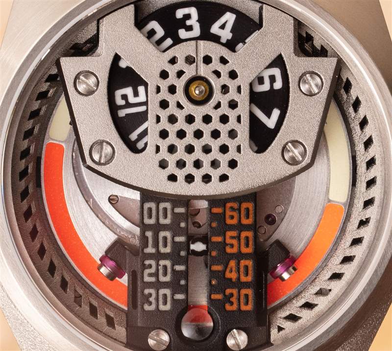 這個戒指有兩個功能。首先,它的外圍裝有一個 ForgeGlow 夜光涂層指示器,當通過位于 6 點鐘位置的小型放大鏡觀察時,該指示器可用作 AM 或 PM 指示器。在此上方是線性分針,它指示半小時向上,另一半小時向下。它的運動是由一種橢圓形的凸輪操作的。最重要的是一個跳時盤。