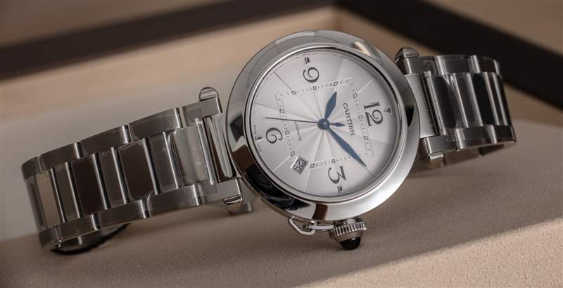 Pasha 的寬度為 41 毫米,佩戴效果很好,但表耳和相對較寬的表圈使手表的磨損偏小。表殼防水深度達 100 米,值得一提,因為腕表的整個設計點都是為了喚起早期表殼防水系統的外觀。在開發旋入式表冠之前,一些手表使用旋入式帽蓋,在表冠周圍形成密封。毫無疑問,這是從食堂借來的概念,從側面看,卡地亞 Pasha 確實像一個時髦的小酒瓶。