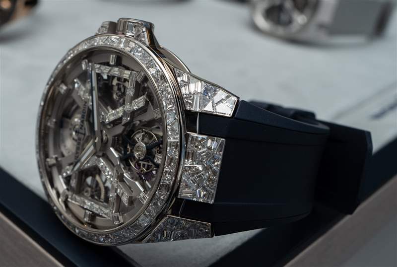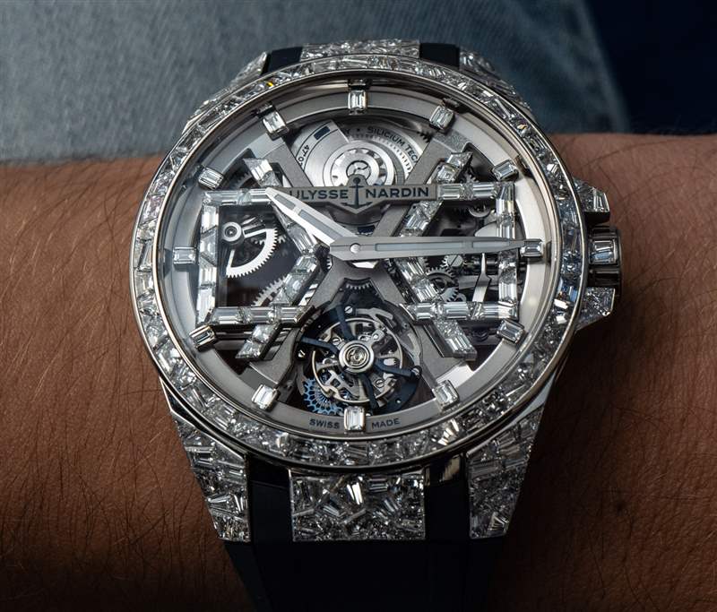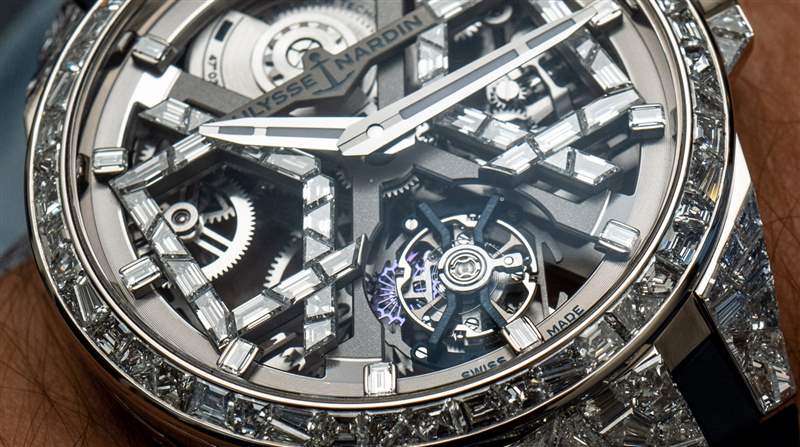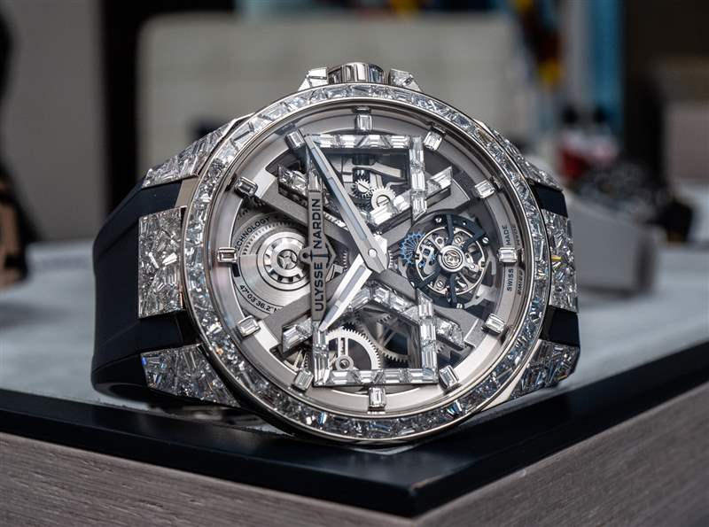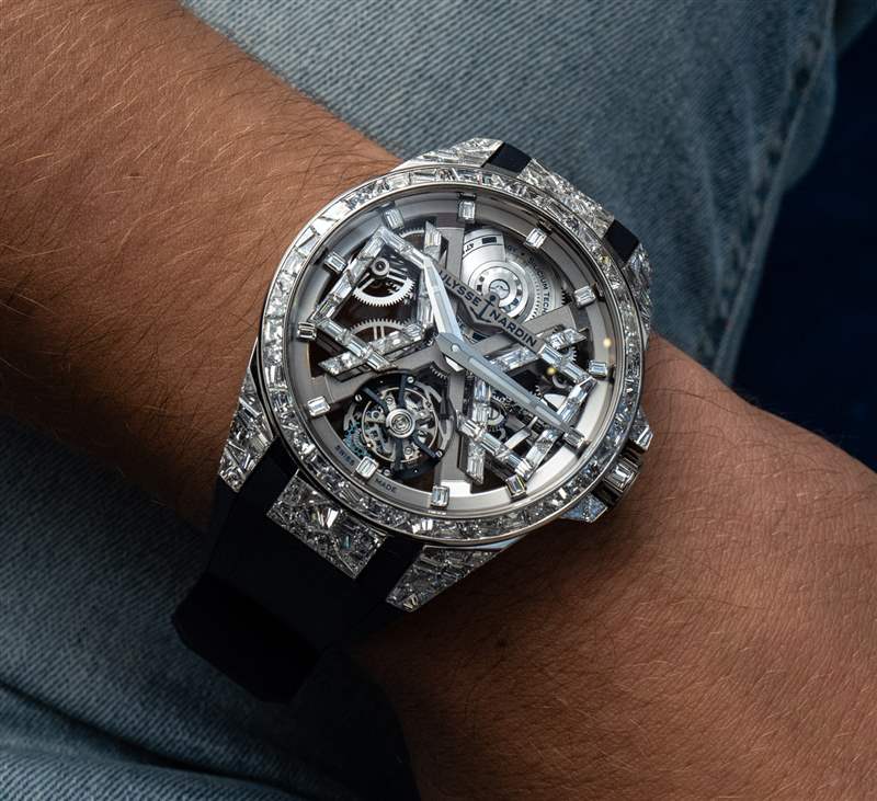 Sabatier 先生最值得稱贊的是他回答問題的深思熟慮的方法,以及他在將其他行業的聰明教訓借鑒到開發和制造機械手表的世界時毫不拘束。從視覺上看,您在圖片中看到的手表是 Ulysse Nardin Blast 的特殊“高級珠寶”版本:覆蓋著鉆石。該手表被稱為參考 1720-400BLE-3A/01 或 1720-400BLE-3A/00 Ulysse Nardin Sparkling Blast。表殼上共鑲嵌 211 顆鉆石(鉆石重量為 13 克拉)。45 毫米寬的表殼由 18k 白金制成,特殊的鉆石鑲嵌風格以更加有機的“裂紋鏡子”風格完成,極具陽剛氣息,在市場上也是獨一無二的。Ulysse Nardin Sparkling Blast 的價格是410,000 美元。