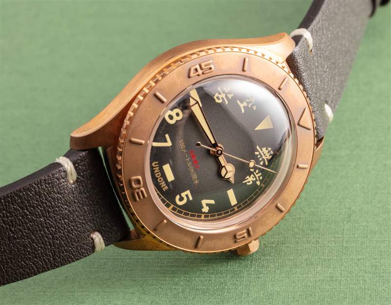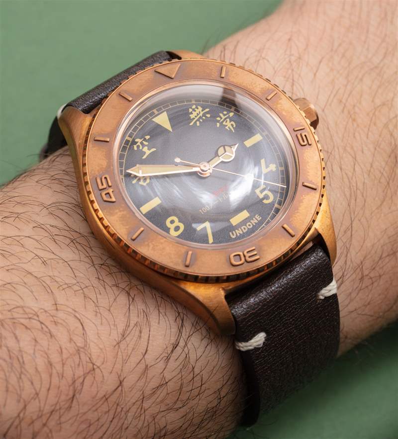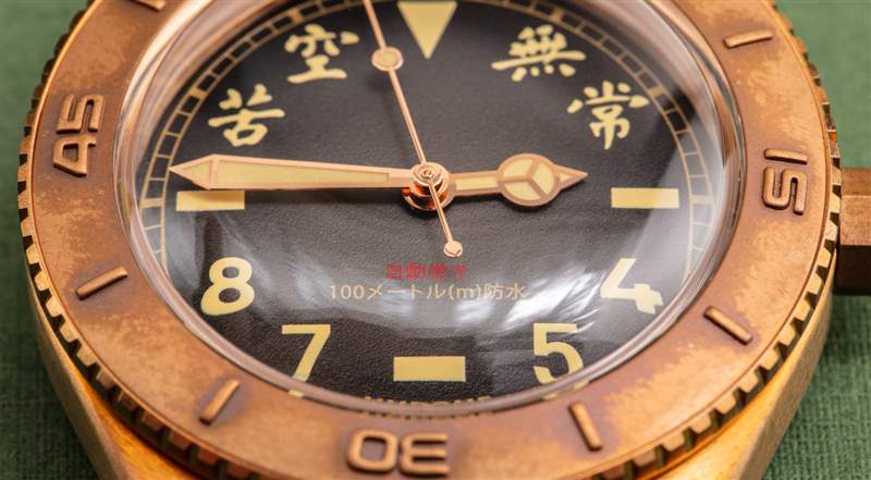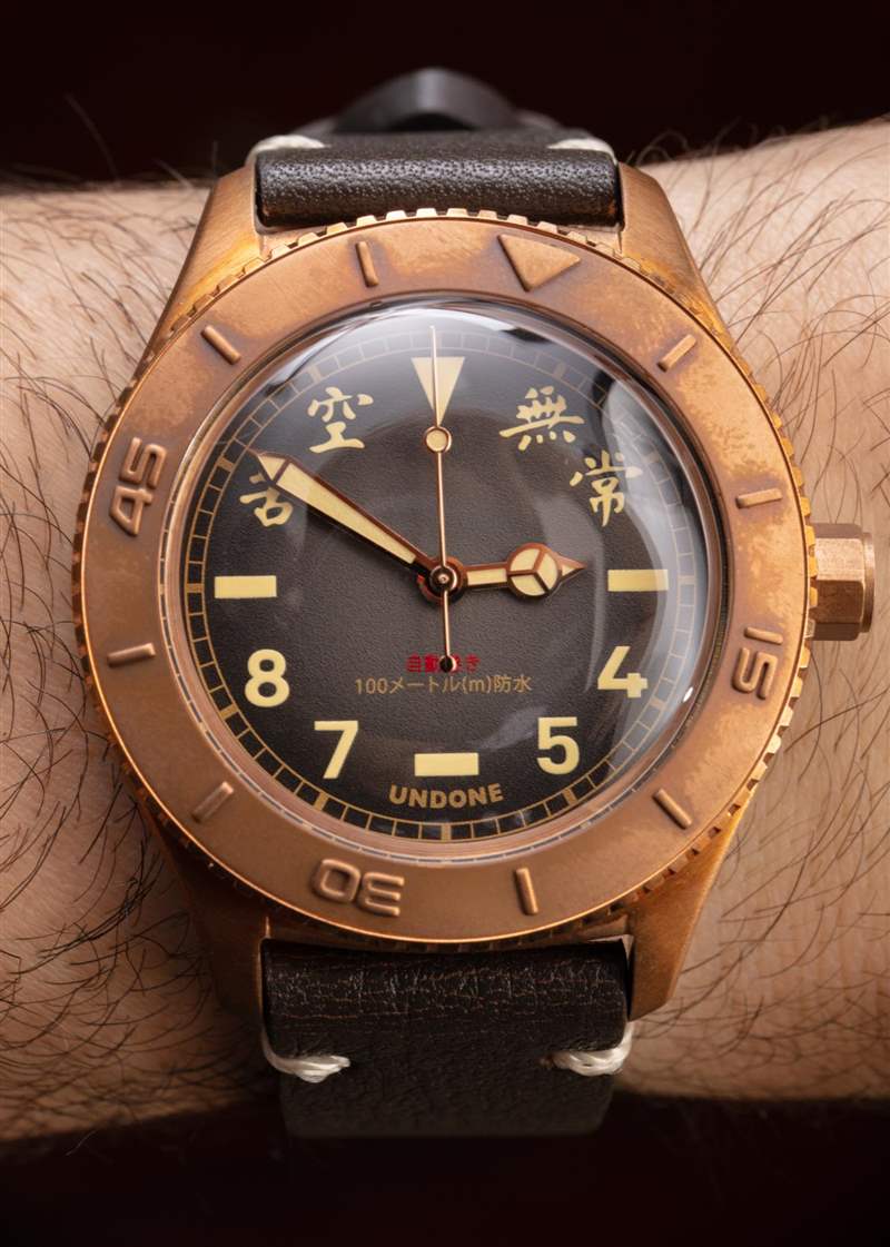 不到一年后,Undone 更新了 Basecamp(Undone Basecamp 2.0 在 aBlogtoWatch 上觀看這里) 具有一些附加功能,例如更多的防水性和其他調(diào)整。從那時(shí)起,大本營(yíng)(連同 Urban)一直是 Undone 應(yīng)用其大部分創(chuàng)意的地方。這款特別的 Basecamp “Kyoto Ghost” Bronze 手表是四款不同(盡管相似)手表系列的一部分,這些手表將青銅表殼引入 40 毫米寬的 Basecamp 表殼。其中兩款 Basecamp Bronze 腕表以日本為主題,采用新穎的“加利福尼亞”表盤,將羅馬數(shù)字時(shí)標(biāo)的上段替換為日文漢字字符。據(jù)說(shuō)這里的文字是對(duì)佛教教義的一種認(rèn)可,這些文字翻譯為“存在、無(wú)常、痛苦和無(wú)自性”。換句話說(shuō),這些手表旨在幫助佩戴者從社會(huì)人類生存的壓力中“釋放”。廣告訊息廣告信息結(jié)束