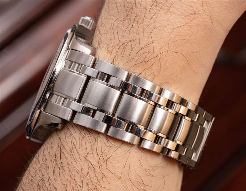 這個特殊版本的 Manero Peripheral 43 毫米是參考 00.10921.08.23.21,它有一個白色的表盤和配套的鋼表鏈。手鐲值得評論,因為大多數 Manero Peripheral 手表似乎都配備了表帶。手鏈與表殼的設計完美融合,拋光表面與光線交相輝映,營造出一種視覺奇觀。從設計的角度來看,表帶略微變細,這有助于在視覺上減輕表殼的質量,也讓表帶佩戴起來更加舒適。Carl F. Bucherer 使用蝴蝶式展開式表扣,手鐲進一步包括半鏈節,使其尺寸更適合您的手腕。