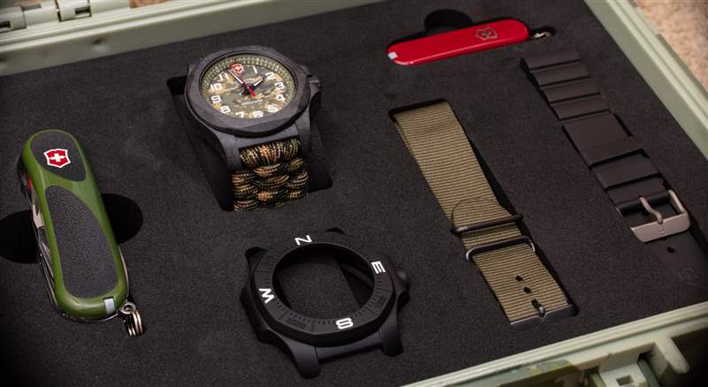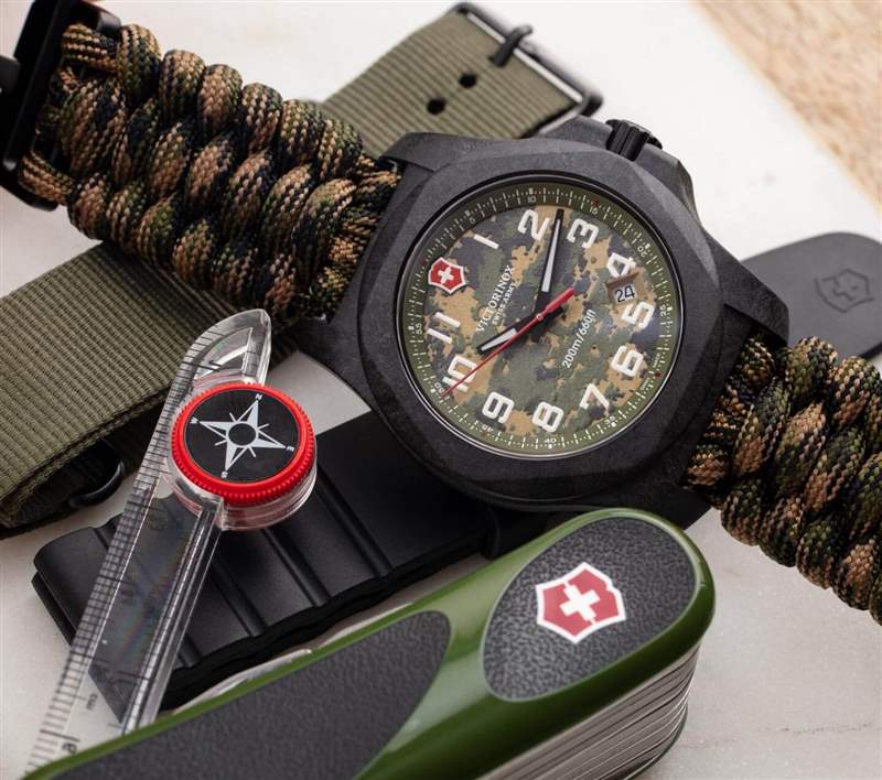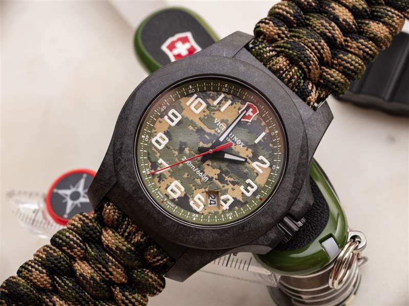 是什么讓 Victorinox Swiss Army INOX Carbon LE 241927.1 手表真正閃耀的是它隨附的套件。首先是迷彩圖案的鵜鶘式表殼。與大多數 INOX 手表不同,它帶有三個表帶。它還配有一把配套的野營瑞士軍刀(帶指南針)和一把額外的經典紅色瑞士軍刀。2017年,Victorinox Swiss Army 與 Naimakka 合作推出其首款 Paracord 表帶(和碳 INOX 案例)。此后,表帶概念得到了提煉,在這款 INOX Carbon LE 型號上,傘繩表帶也是一款舒適且易于佩戴的表帶。傘繩采用迷彩風格,套件還配有一條卡其綠色 NATO 風格的表帶,以及一條黑色橡膠表帶。還包括一個黑色 INOX 外殼保險杠,如果您想要更高的耐用性和耐環境性,您可以將其安裝到外殼上。