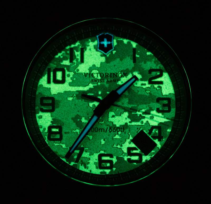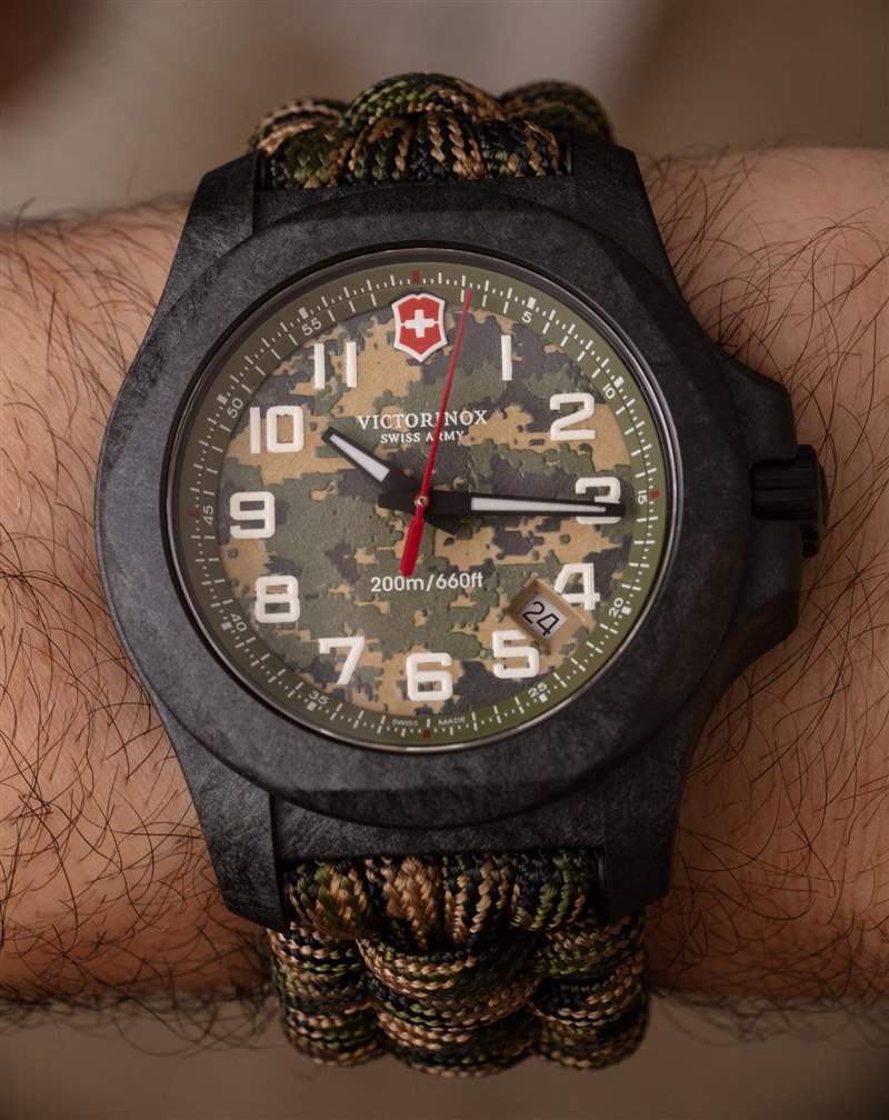 這款限量版的 43 毫米寬碳纖維表殼采用全新的阿拉伯數字表盤和林地迷彩主題。鑒于良好的對比度,表盤非常清晰易讀,也讓人想起早期 Victorinox 瑞士軍表的簡單設計,例如“One”。另一個特別之處是全發光表盤,當它發光時,會露出迷彩圖案的設計。表盤上方是 AR 涂層藍寶石水晶,表殼防水深度達 200 米。這個版本的 INOX 內部是帶有時間和日期的瑞士制造 Ronda 715 石英機芯。