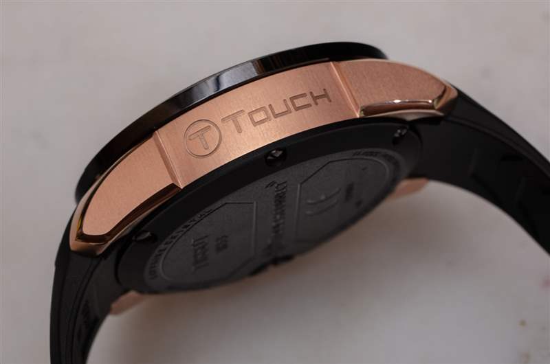T-Touch Connect Solar 是一款戴在手腕上的大型手表,但佩戴起來非常舒適,尤其是在舒適的橡膠表帶上。這款手表也比你想象的要輕,因為鈦金屬表殼是 PVD ??涂層,帶有玫瑰金色調(diào)。擋板采用黑色陶瓷制成(帶有發(fā)光的導航標記)——這很重要,這樣它正下方的天線就可以接收信號。即使設計略有老化,T-Touch 表殼(尤其是表鏈上的表殼)也為現(xiàn)代互聯(lián)時計提供了出色的基礎。廣告訊息廣告信息結束