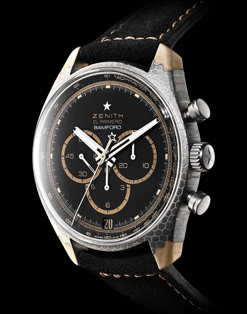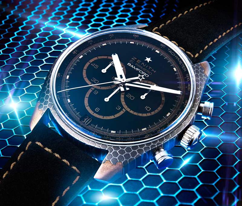 Bamford 帶來了 Black Badger 的特殊表殼材料,以及表殼材料的加工方式,這款限量 20 枚的手表系列被稱為 Zenith El Primero “超導(dǎo)體”,因?yàn)楸須げ牧蟻碜噪姎夤こ痰挠^點(diǎn),一種超導(dǎo)體(相對(duì)于絕緣體)的電。作為鐘表,這對(duì)手腕有影響嗎?不,但超導(dǎo)體銅鈮混合物也具有一些有趣的美學(xué)品質(zhì)。如果處理得當(dāng),這種銅鈮金屬結(jié)構(gòu)在材料中具有令人驚嘆的蜂窩狀陣列,經(jīng)過部分酸洗的表殼進(jìn)一步使這一點(diǎn)變得有趣。我不是案件材料本身的專家,