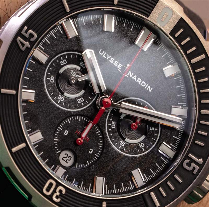 表盤上方是圓頂藍寶石水晶鏡面,兩側均鍍有增透膜。表盤專為易讀性而設計,拋光指針和時標僅帶有一絲浮華。Ulysse Nardin 確保通過啞光質感表盤和易于查看的計時指針保持表盤實用性。(請注意,計時碼表和主指針都具有發光功能,以便在黑暗中觀看。)表盤對稱是理想的,即使日期在 6 點鐘小時標記上方的圓形窗口內也能保持平衡。表盤文字被最小化并巧妙地集成到外秒刻度或計時碼表子表盤等位置。起初,Diver Chronograph 表盤可能看起來很簡單,但其精致的特性讓它在您的手腕上戴上一段時間后會在您身上生長。