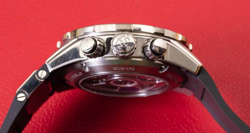 表盤周圍是一個平滑的旋轉表圈,發出悅耳的咔噠聲,其設計再次從傳統的雅典航海手表中汲取靈感,但也做了一些新的事情。除了表殼本身的設計,Diver Chronograph 的表圈也賦予了這款 Ulysse Nardin 腕表視覺上的獨特性。在我看來,計時碼表按鈕是旋入式的,這有點復古。雖然這是在潛水員計時碼表中獲得更多防水性能的一種經過驗證的真正方法,但我希望看到品牌朝著計時碼表復雜功能不需要旋入式按鈕甚至可以完全操作的方向發展水下(可能不會低至 300 米,但至少 50 或 100 米)。手表的左側是一塊帶有手表序列號的小金屬牌。該區域用于限量版編號,例如僅限美國的限量版紅色、白色和藍色“Hammerhead”參考 1503-170LE-3/93-HAMMER 版本的 Diver Chronograph。廣告訊息廣告信息結束
