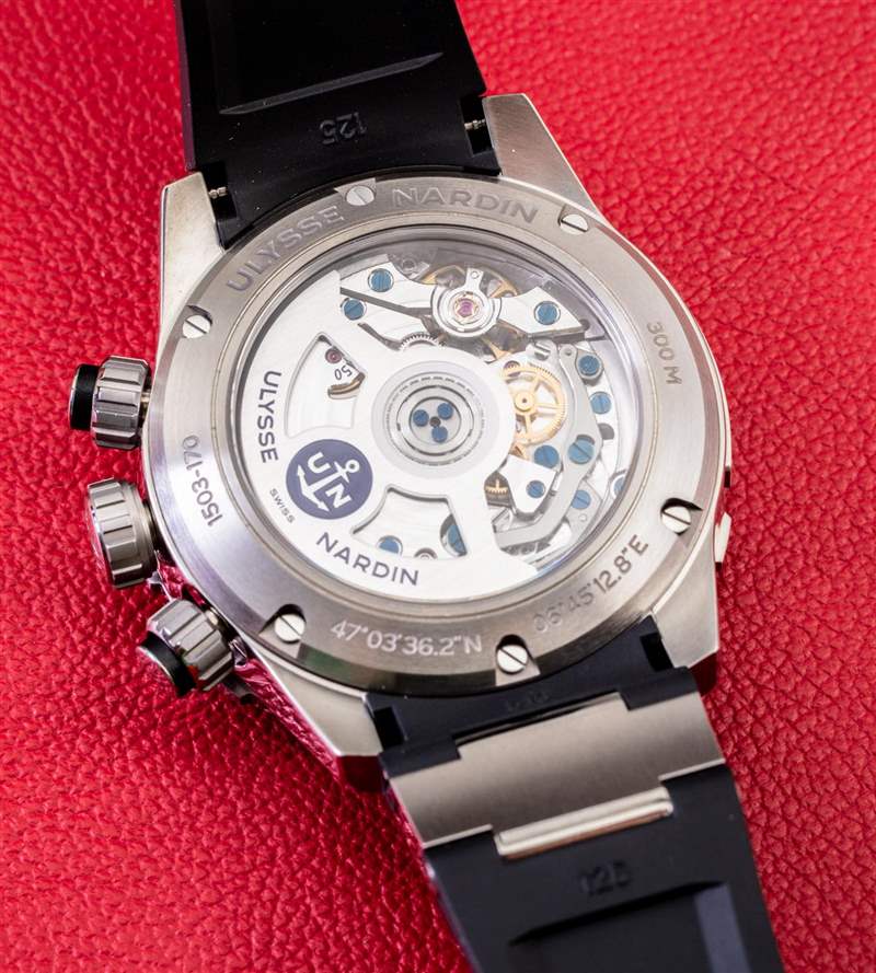 手表內部是一個奇妙的機芯,內部制造的 Ulysse Nardin 口徑 UN-150。該機芯于 2013 年左右首次亮相,是該品牌的高級自動 12 小時計時機芯。UN-150 外形美觀,工作頻率為 4Hz (28,800 bpm),動力儲存 48 小時。由 322 部分組成的機芯在 Ulysse Nardin 為性能進行了單獨調節,并且還受益于硅擒縱機構以增加計時性能。將腕表翻轉過來,透過底蓋查看 UN-150 機芯,這有助于為這款奢華運動腕表增添令人印象深刻的外觀。