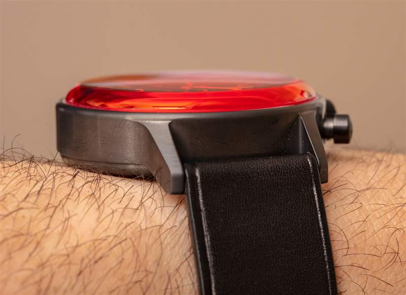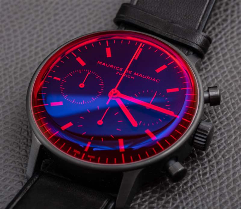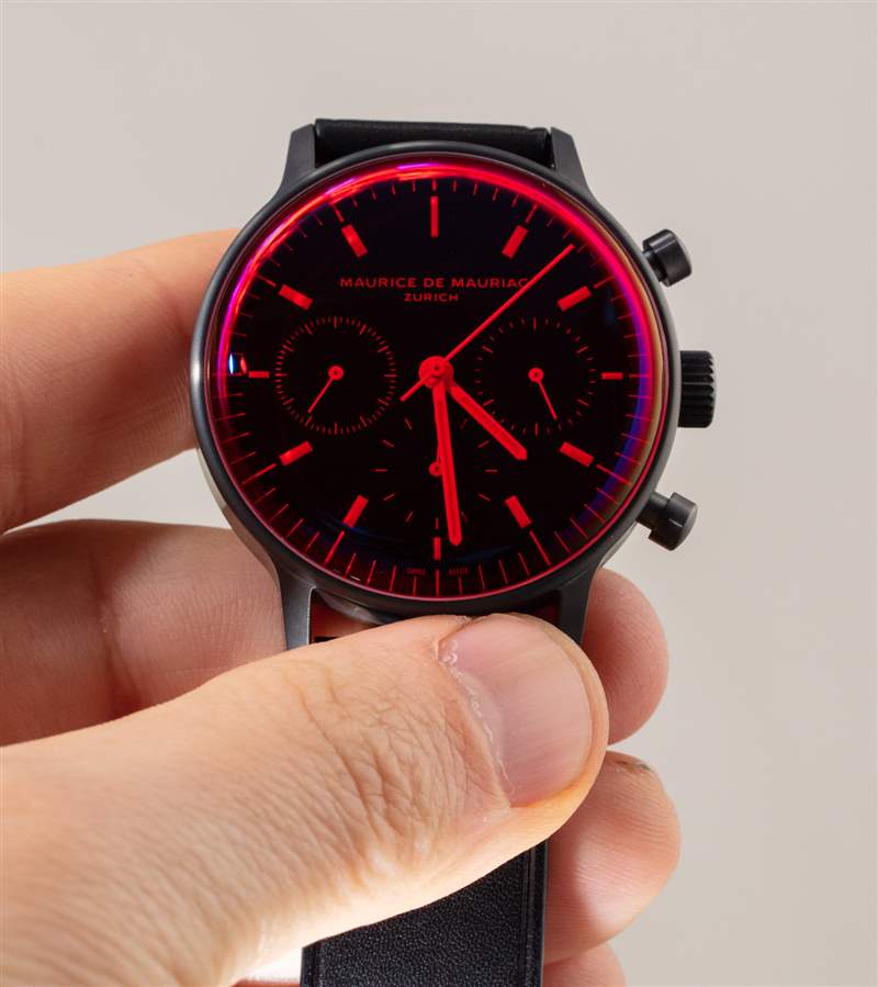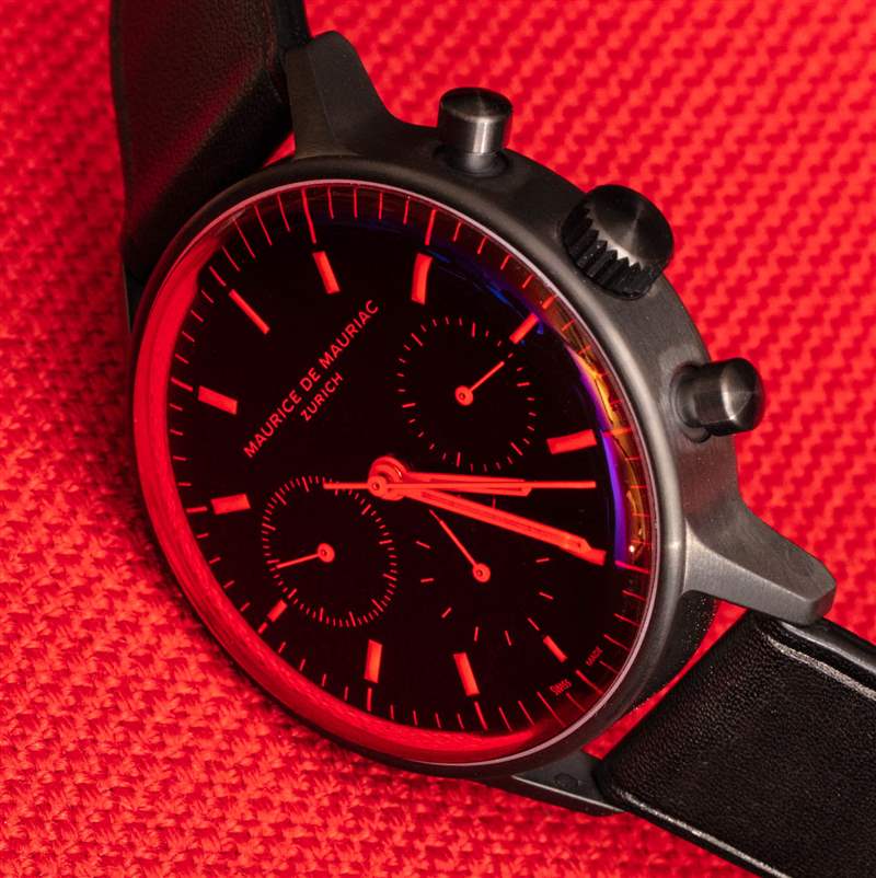 L3 Chronograph 表殼寬 40.5 毫米,厚約 13-14 毫米,表耳到表耳的距離約為 48 毫米,表帶的表耳寬度為 20 毫米。表殼防水僅為 30 米——不幸的是,這不是一款適合游泳的運動手表。這種特殊版本的精鋼表殼采用 DLC 涂層,呈現無煙煤色(不是完全黑色),使其外觀更光滑、更柔和,并與水晶完美搭配。說到紅水晶,我確實提到這是 Maurice de Mauriac 帶回的設計美學。2011 年,我在回顧Maurice de Mauriac Chronograph Modern Tactical Vision 手表時首次介紹了該品牌的這一非??岬内厔荨赡旰蟮?2020 年,我回顧了一款帶有紅水晶的手表,即Maurice de Mauriac Chronograph Modern Travel Timer.?事實上,就在莫里斯·德·莫里亞克 (Maurice de Mauriac) 透露這款今天首次亮相的帶有紅色水晶的 L3 計時碼表的幾周前,我問,“現在是時候帶回一些彩色水晶了嗎?”?看起來他們在那方面比我領先一點。