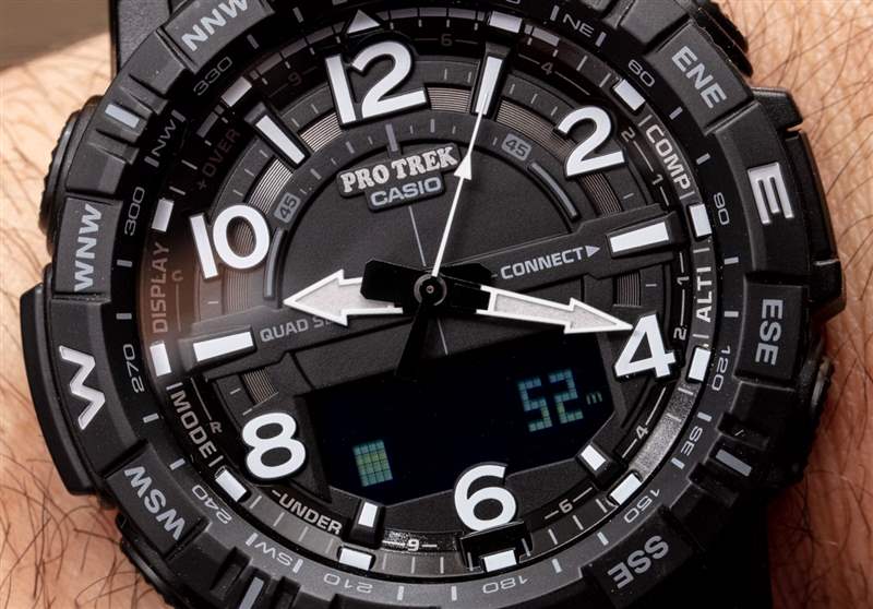 盡管小負片(所謂的暗屏)LCD 顯示屏不會占據 PRT-B50 表盤的大部分,但您會經常使用它。也就是說,我喜歡從遠處看,這款 Pro Trek 看起來或多或少像一個完全模擬的手表。默認屏幕可以數字顯示時間、日歷、步數或氣壓圖形(用于天氣預報)。外殼上的專用按鈕可讓您快速激活高度計和指南針功能。這些將秒針重新用作模擬指示器,例如指南針。該系統相當完善并且運行良好;它的性能也很活潑。