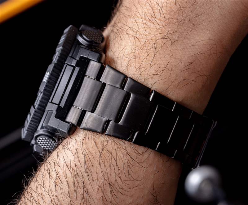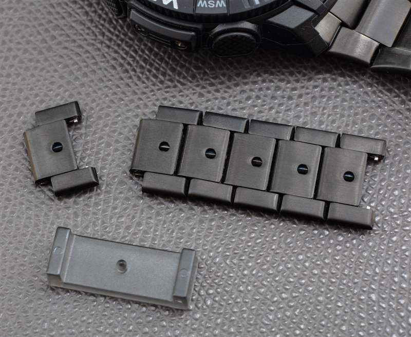 Pro Trek 也是一款重量更輕的手表,即使在鈦金屬表鏈上也非常明顯??偟膩碚f,這款手表的重量僅為 64 克。在手腕上,你真的感覺不到任何東西在那里。最后,Pro Trek PRT-B50 在易讀性方面略勝過 G-Shock Mudmaster GG-B100,這要歸功于表盤的高對比度和非常易于閱讀的指針和時標(兩者都涂有夜光漆) )。同樣,如果您想要一個帶有鈦手鏈的 G-Shock,它的價格將比 PRTB50YT-1 的零售價高出很多。說到手鏈,讓我稍微討論一下,因為對我來說,這是一個新的手鏈設計,我認為它的巧妙工程需要一些討論。