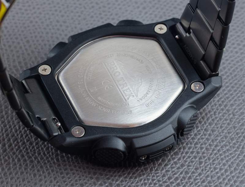 Pro Trek PRT-B50 表殼的其余部分采用啞光黑色樹脂制成,現在部分延伸到表背上,以提供更耐用的材料。G-Shock 具有 200 米的防水性能,而 Pro Trek 具有 100 米的防水性能。旋轉表圈的高度也旨在保護水晶免受不必要的沖擊。案例本身很有吸引力,但在某種程度上一直故意比 G-Shock 更保守。現在更大的 G-Shock 式推桿很容易按,但表殼上有很多推桿(總共六個)??ㄎ鳉W也未能在外殼正面的底部中心按鈕上貼上用于激活背光的標簽。