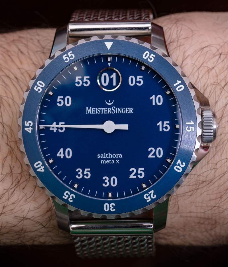 在表盤周圍,旋轉表圈有一個藍色陶瓷嵌件。Salthora Meta X 的其他版本具有深灰色陶瓷嵌件。MeisterSinger 還使用顏色,在一個實例(參考 SAMX902)中,跳時盤具有不同的顏色,以便更輕松地讀取時間。然而,藍色將是 MeisterSinger Salthora Meta X 系列中最時尚的表盤顏色,這就是我推動改進理念的原因。