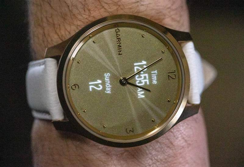 然后是巧妙的表盤,它將傳統的時針和分針疊加在“隱藏”的彩色 AMOLED 顯示屏上。Vivomove 在表殼上沒有按鈕,所有功能都必須通過按下或滑動藍寶石水晶(或使用 Garmin Connect 應用程序)來操作。當您想要激活手表時,您需要抬起并轉動手腕,或者在屏幕上輕點幾下健康。