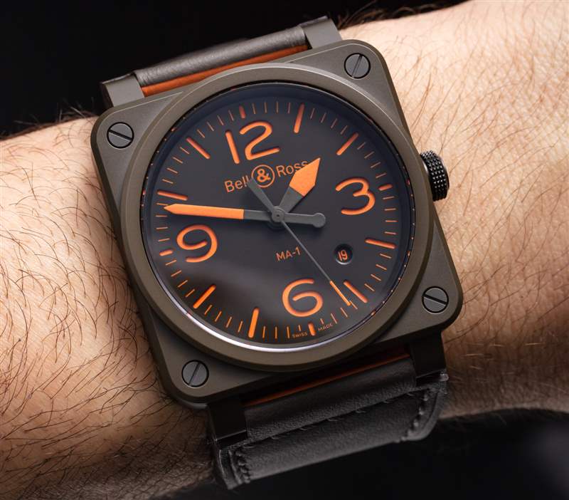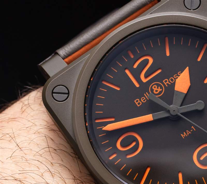 啞光綠色陶瓷表殼寬42毫米,表盤為“三明治式”,下層為橙色發光體,上方為綠色“模板表盤”。手表內部是一個基本的瑞士 ETA 2892 自動機芯。表盤上方是 AR 涂層藍寶石水晶鏡面,BR03 表殼防水深度達 100 米。