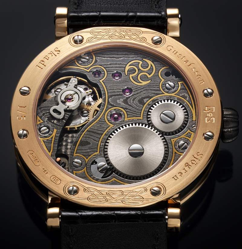 乍看之下,Skadi 腕表似乎沒有寶石,但藍(lán)色藍(lán)寶石由 Peter deWit 鑲嵌在每個(gè)時(shí)標(biāo)以及表冠上。最后,表耳和底蓋由 Anders Hedlund 鐫刻,其圖案靈感來自維京時(shí)代的藝術(shù)品。請注意,手表的機(jī)芯(通過底蓋窗口可見)也使用了 Gustafsson Damasteel 生產(chǎn)的主板。該機(jī)芯是 Unitas 6498 底座的改進(jìn)版,顯然是由 Soprod 生產(chǎn)的。這是一款天文臺級別的機(jī)芯,大馬士革鋼板上還有更有趣的裝飾。