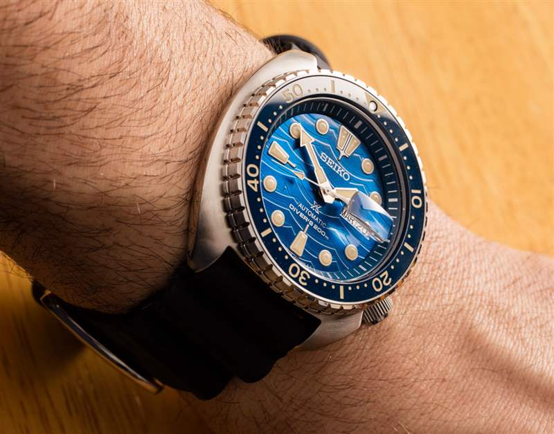 在您將手表戴在手腕上并體驗制造質量和表盤易讀性之前,很難用文字描述精工的質量如何增加。拋光拉絲精鋼表殼防水深度達 200 米,寬 45 毫米,厚 13.2 毫米,表耳之間的距離為 47.7 毫米。考慮到表耳不太寬,對于 45 毫米寬的表殼來說,它的磨損很小。擋板是一種旋轉和抓握的樂趣。我仍然不知道為什么精工在沒有精工標志的情況下將表冠(位于 4 點鐘位置,這樣它就不會刺到你的手上)毫無裝飾。再說一次,重要的是它為更高端的 Prospex 模型保留了特定功能,否則幾乎沒有理由選擇這些模型而不是像 Prospex King Turtle 這樣的優秀模型。
