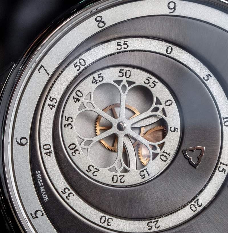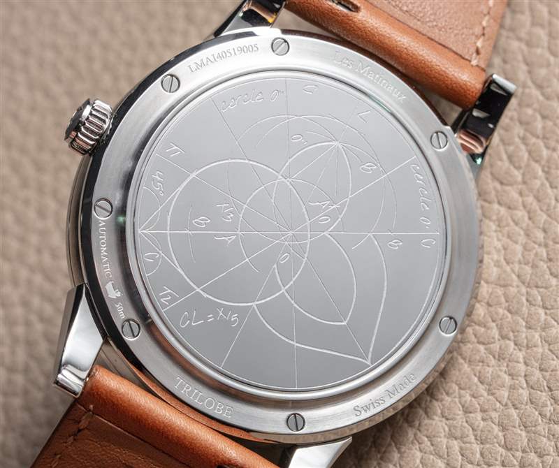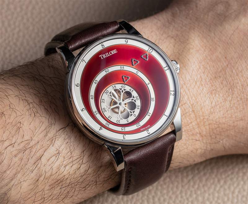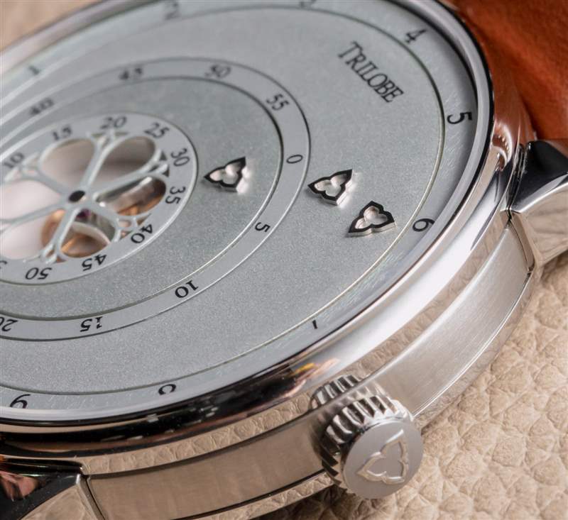 像 Les Matinaux 這樣的手表的訣竅是防止表盤看起來太平。手表表面采用了各種技術來解決這個問題,但沒有指針的表盤仍然存在這個問題。另一個問題(真的是口味問題)是用于讀取時間的指示箭頭的位置。它們被偏心地放置在表盤上,這是 Trilobe 有目的的舉動,同時也不會吸引其他個人要求更精確對稱的鐘表愛好者。
