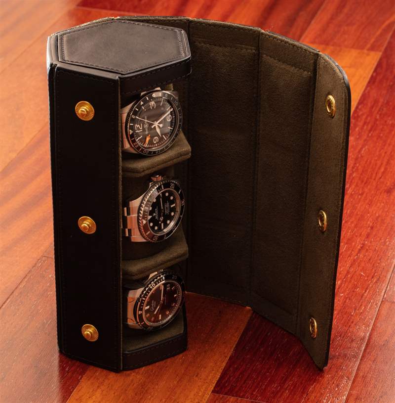 Watch Roll 獨特的六邊形設計是其安全閉合的一部分,因此它可以兼作展示表面。柔軟的 Alcantara 襯墊襯里非常適合放置手表(防滑),此外它也非常耐磨??紤]到卷是如何由幾個扁平部分組成的,它們卷成一個展示托盤,這為 Watch Roll 增加了實用性。