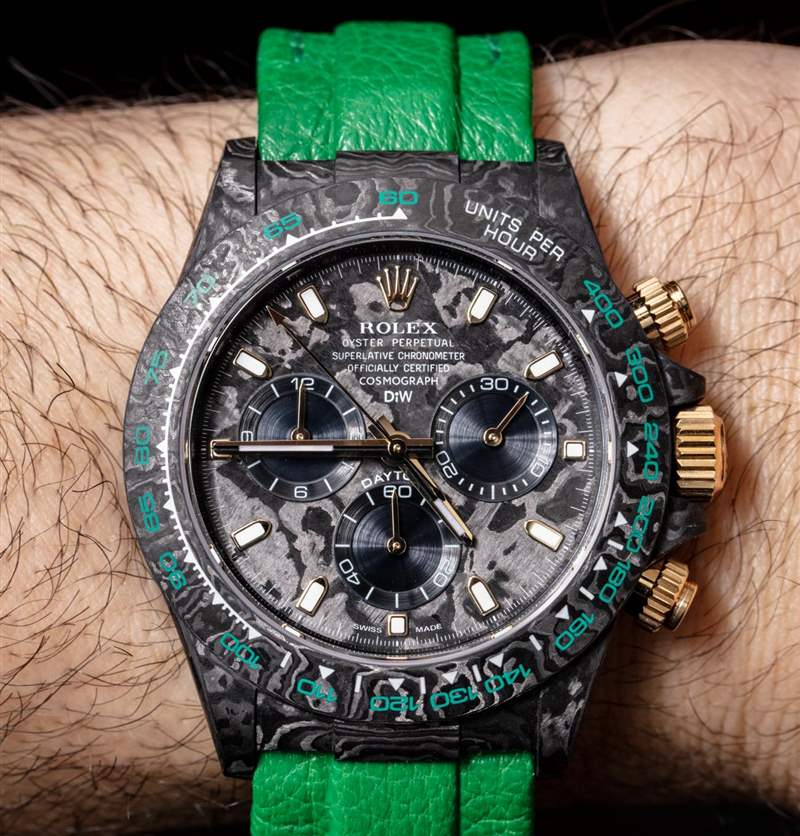 這一切都讓我親身體驗了一家名為 Designa Individual 的公司的售后市場改裝勞力士蠔式恒動宇宙計型迪通拿,該公司將其稱為“碳翡翠”。這是我處理過的許多售后勞力士手表之一。然而,這是我第一次看到全碳外殼。該公司對碳表殼的精確切割感到非常自豪,它具有優雅的質感,與金屬代托納手表相比非常輕巧。Designa Individual 似乎有點像 Richard Mille 的主題,但采用的是定制的 Daytona。它很有效,18k 黃金、黑碳和綠色表帶的組合營造出非常有靈感的外觀。請注意,Designa Individual 提供少量限量版勞力士迪通拿,帶有碳纖維表殼和綠色以外的顏色(和表帶)。碳翡翠是,