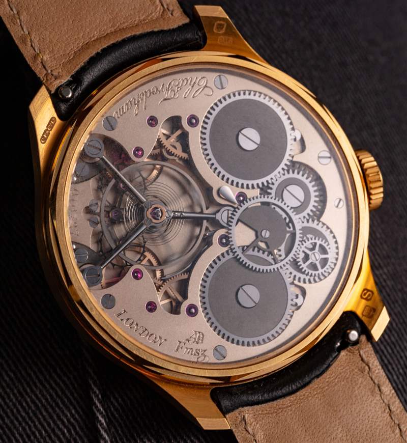 該系統有自己的防震系統,軸承非常穩定,運行頻率為 3Hz(21,600 bph),動力儲備為 36 小時。手工裝飾和組裝的機芯需要數小時才能生產,是雙脈沖天文臺產品的真正亮點。磨砂機芯橋板更典型的英國(相對于瑞士)手表機芯設計。帶有蝸牛殼風格圖案的齒輪以及應用箭頭用作手表機芯側的動力儲存指示器。該系統給我留下了相當深刻的印象,盡管我希望看到 Charles Frodsham & Co. 安裝一個更大的主發條盒,因為雙脈沖調節系統似乎是一個動力豬,而且今天的許多手表所有者都期望在僅限時間的手動上鏈腕表可提供至少兩天的動力儲存。