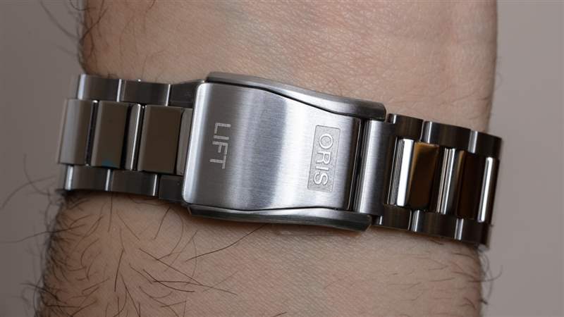 附在手表上的是一個三連桿錐形表鏈,與 ProPilot Big Date 的外觀相得益彰。我最喜歡的手鐲部分是展開式表扣。對于這款手表來說它并不是全新的,但對于 Oris 來說它是較新的,并且基于駕駛艙安全帶的打開系統。它不僅看起來很酷,而且操作起來很舒服。雖然我想象扣子可能會不時抓住東西,所以我想知道安全鎖是否有用。話雖如此,扣子從未在我身上打開過。否則手鐲相當簡單直接。我覺得 Oris 可以設計一個微調系統,或者至少提供一個半連桿。Oris Aquis 潛水表的表帶功能更強大,包括半鏈節、微調裝置和鏈節之間的螺絲桿。ProPilot Big Date 手鏈要簡單一些,