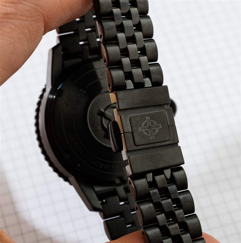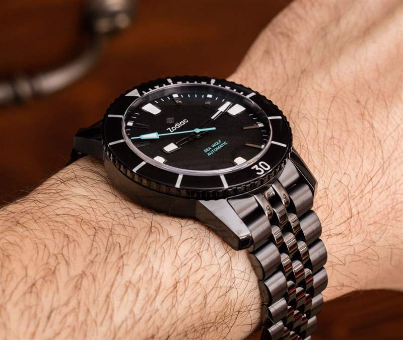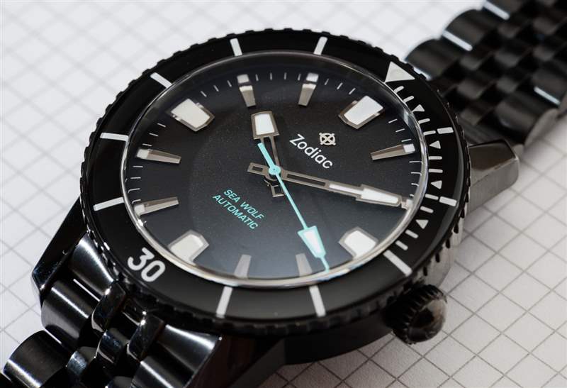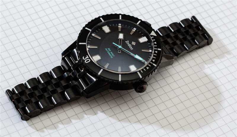 對(duì)比度很有趣,因?yàn)殡m然它可以在幾乎所有情況下幫助易讀性,但太多的對(duì)比度會(huì)導(dǎo)致強(qiáng)烈的對(duì)比色……這會(huì)導(dǎo)致整體優(yōu)雅的侵蝕。在 Super Sea Wolf 53 Black 上特別好用的是黑色 40 毫米寬的表殼和配套的表鏈。至少可以說,很難找到這樣的黑色手鏈,因?yàn)槭宙湹拿恳粔K都應(yīng)該單獨(dú)涂層。我不確定 Zodiac 使用了什么工藝(因?yàn)檫@款手表的售價(jià)僅比非黑色款高一點(diǎn)),但鋼表鏈上的黑色涂層非常均勻,有助于為這款表鏈設(shè)計(jì)注入新的活力。廣告訊息廣告信息結(jié)束