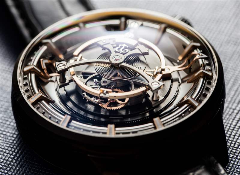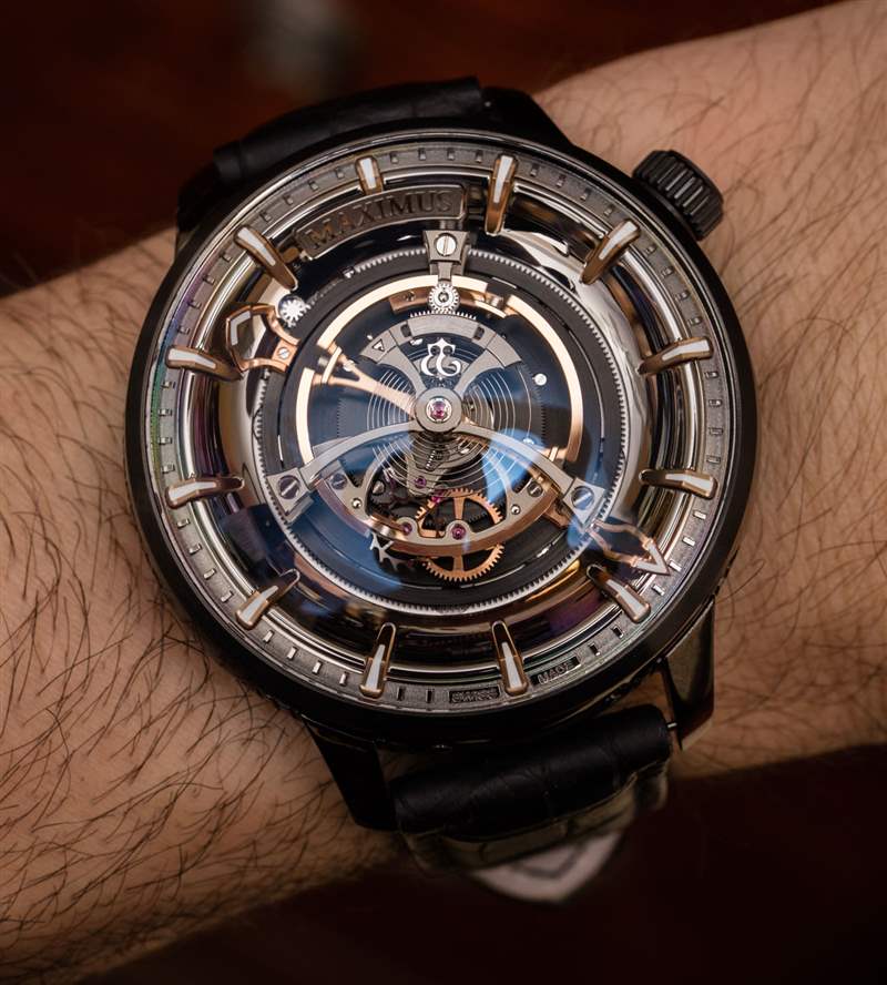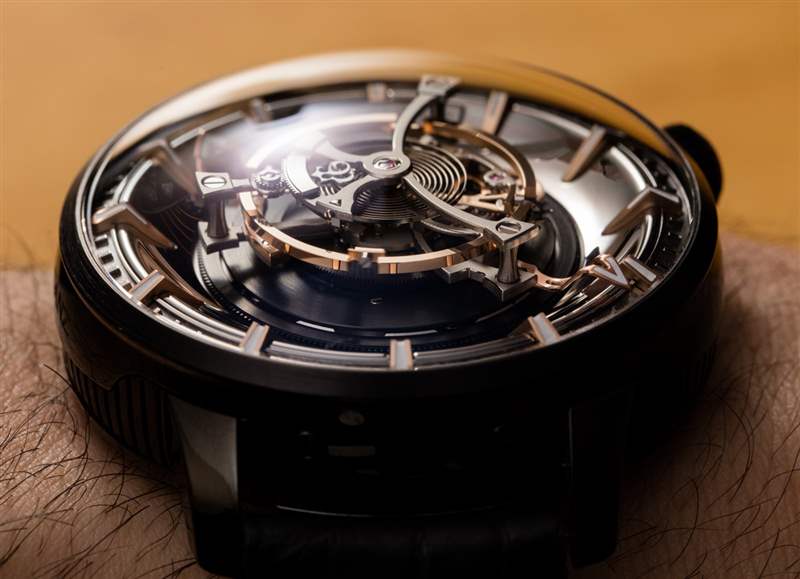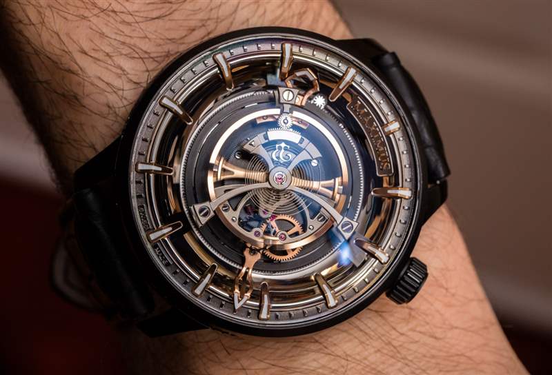 后一種說法不僅是 Maximus 49 毫米寬的表殼尺寸的功能,還因為機芯的小時鐘音量滴答聲來自為陀飛輪提供動力的高扭矩機芯的正常運行。表殼(此處為黑色涂層鈦金屬)也約 23 毫米厚,??頂部是大型 AR 涂層圓頂藍(lán)寶石水晶。盡管表殼的比例確實很大,但由于粗短的表耳和 54 毫米的表耳間距,Kerbedanz 使 Maximus 可穿戴。簡而言之,雖然這絕不是一款小巧的時計,但表殼設(shè)計確實允許大多數(shù)愿意佩戴的手腕輕松佩戴。
