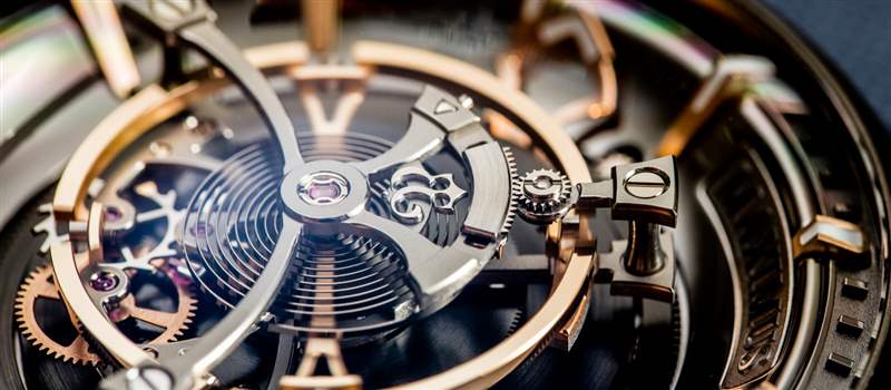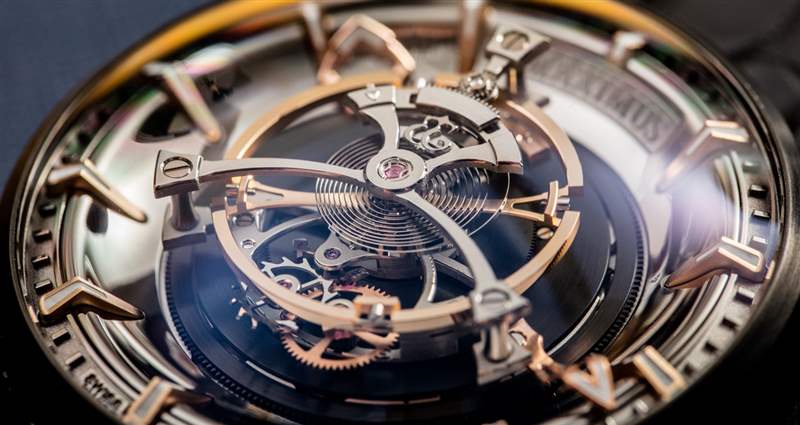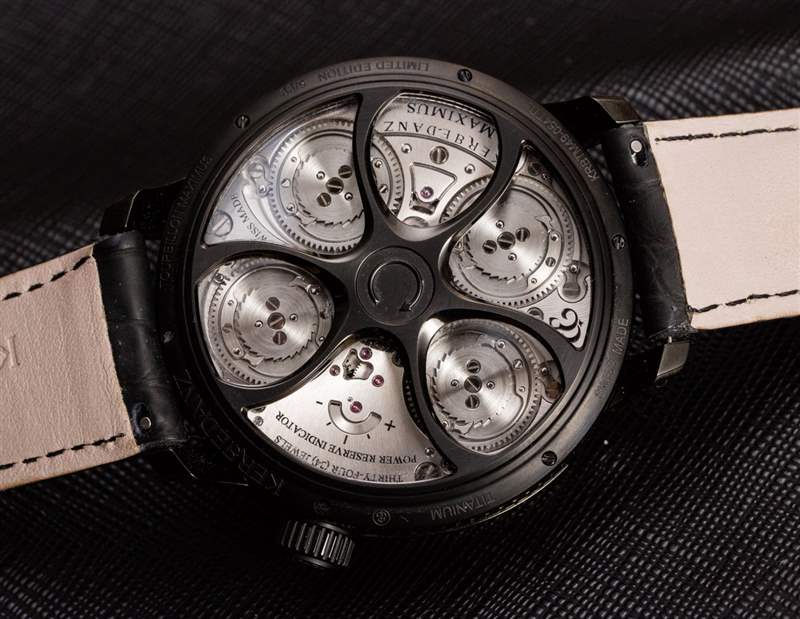 從技術(shù)上講,Maximus 手表的后部可能對我來說是最有趣的——我發(fā)現(xiàn)上弦機制是一種特別的樂趣,因為在轉(zhuǎn)動時發(fā)條盒齒輪的觸覺反饋和愉快的咔噠聲。只聽發(fā)條盒齒輪的咔嗒聲就足以讓您想上弦。我將它與 Ulysse Nardin Freak 中的上鏈系統(tǒng)進(jìn)行了比較,這有點相似,因為你必須上弦才能上弦主發(fā)條。大多數(shù) Ulysse Nardin Freak 手表的手指直接轉(zhuǎn)動單個主發(fā)條盒,因此動作或多或少是無聲的,沒有反饋。在 Maximus 中,您不是直接為一個發(fā)條盒上弦,而是控制一個同時為所有四個發(fā)條盒上弦的傳動系統(tǒng),這就是您獲得良好反饋的原因。即使擁有如此強大的力量,