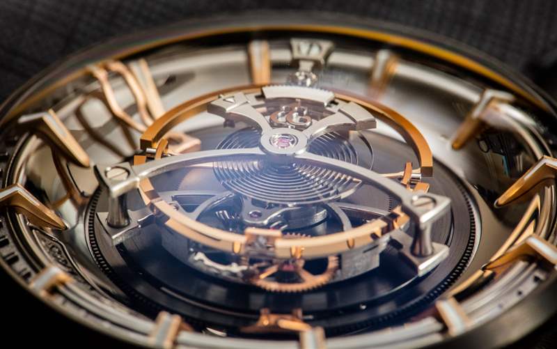KRB-08 機芯的厚度使其能夠為如何擁有中央陀飛輪和中央安裝指針提供一個有趣的解決方案。指針安裝在凸起的陀飛輪表殼下方并向上彎曲。用戶看不到大部分指針,而是看到指針的箭頭式提示,小時和分鐘是不同的。它們遵循高度彎曲的章環(huán),該環(huán)帶有應(yīng)用的時標(biāo)(此特定版本的 Maximus 為玫瑰金色)。請注意,Kerbedanz 聲稱其表盤和指針是內(nèi)部生產(chǎn)的,并且它們是用黃金制成的。我不會認(rèn)為 Maximus 是一款過于清晰的手表,但它的效果非常好。只需不使指針鏤空,就可以輕松實現(xiàn)更清晰的表盤。