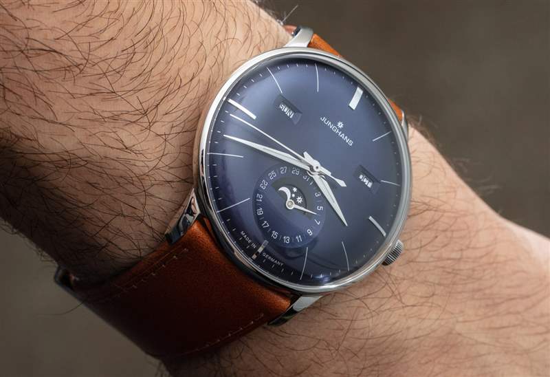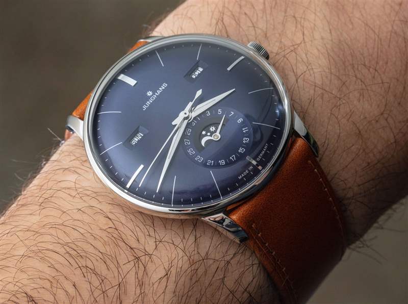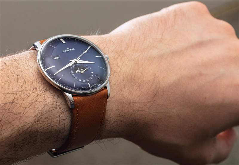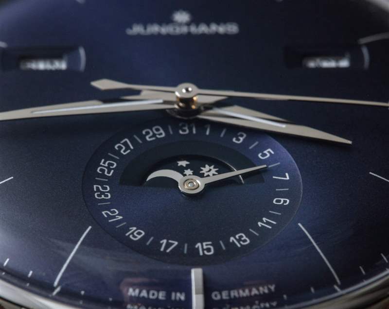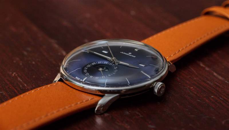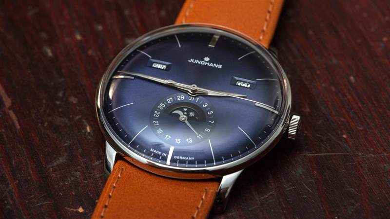作為一款日歷手表,Meister Calendar 提供月份、星期幾、日期和月相指示器。我認為機芯是一個完整的日歷,在奇數月需要調整日歷方面,它有點低于年歷。要調整日歷設置,只需使用位于表殼兩側的小嵌入推桿。我真正喜歡的是信息的傳統(tǒng)對稱布局,以及窗口的使用(與所有表盤相反)。表盤用于日期指示器,其中有一個用于月相指示器的窗口。請注意,Junghans 為手表提供英文或德文的日歷信息。
