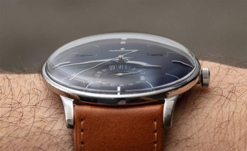 手表上的傳統(tǒng)元素比比皆是,包括與表殼和水晶相匹配的弧形表盤。很少看到用這種弧形表盤生產的手表。令人印象深刻的是,Junghans 能夠隱藏機芯的相對厚度,因為它既有基礎機芯,也有日歷信息模塊。太陽紋處理過的藍色表盤帶有近乎紫色的色調,質地非常棒,因為它有一點光澤,但不會反射造成眩光。