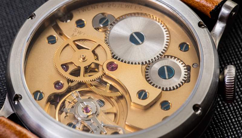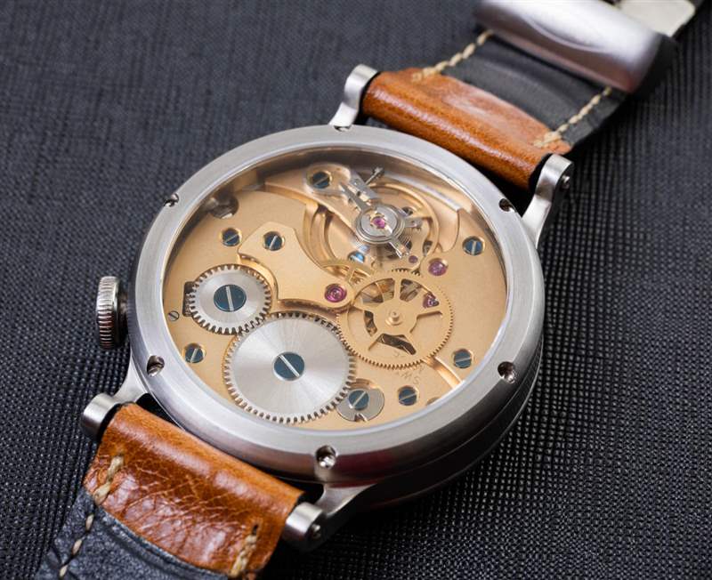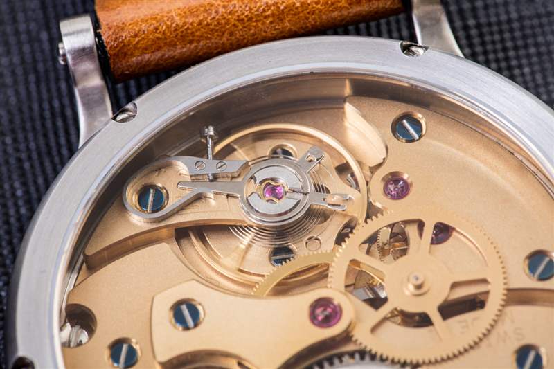 ReOrder 的金色表盤版本的優點在于機芯與面部的匹配度。Itay Noy 將這種手動上鏈機械機芯稱為 IN.IP13 機芯。它似乎使用了一個基本的 UNITAS 體系結構,該體系結構已經進行了很好的修改。該機芯(可通過展覽底蓋查看)提供 42 小時動力儲存,并以 3Hz(21,600 bph)的頻率運行。添加的橋板和齒輪以及橋板的罕見金色調和藍鋼螺絲使機芯看起來很有趣。