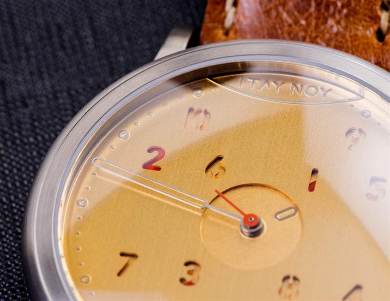 Itay Noy 目前生產三個版本的 ReOrder 手表,除了這個整潔的金色表盤版本外,還包括一個白色和藍色表盤。我相信白色表盤 ReOrder 可能是最清晰易讀的,但金色表盤搭配拉絲精鋼表殼和淺棕色皮革表帶確實在視覺上對我說話。易讀性并不完全是 ReOrder 的強項——這也許并不完全令人驚訝。表盤比例正確,但在這款金色表款上,鏤空分針或時標下方的紅色部分并不容易一目了然。事實上,一開始,骨架式手的整個用法讓我感到困惑。我的意思是我明白,從藝術上講,它們與小時標記窗口一起使用,但表盤上最清晰的指針(小秒針)真的很小,而且,