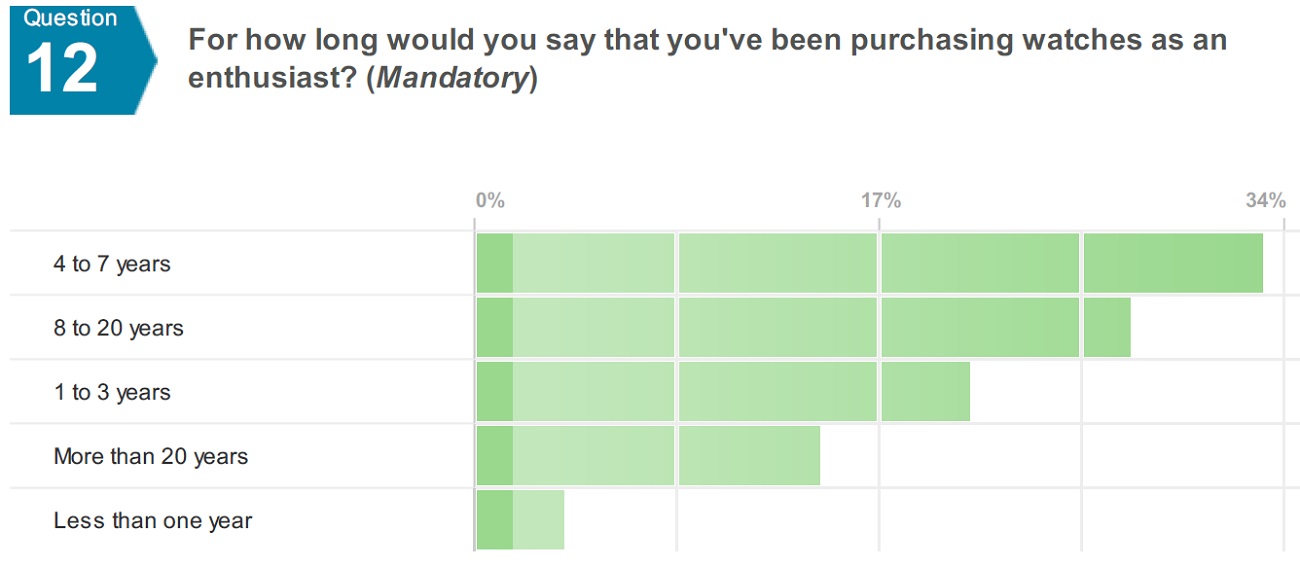 我發現 aBlogtoWatch 非常有趣的一點是,它已經發展成為成熟收藏家的平臺。只有25%的觀眾收藏不到三年,只有4%的人收藏不到一年。因此,98% 的人擁有超過 2 塊手表,59% 的人擁有 5 到 30 塊手表也就不足為奇了。據報道,有 2% 的人擁有 100 多塊手表。廣告訊息廣告信息結束