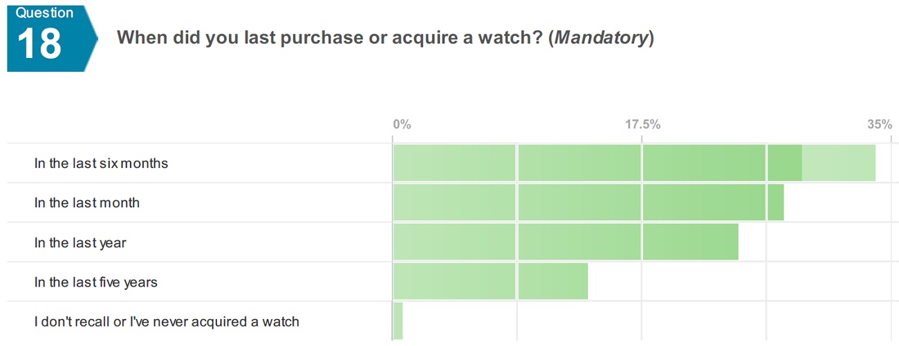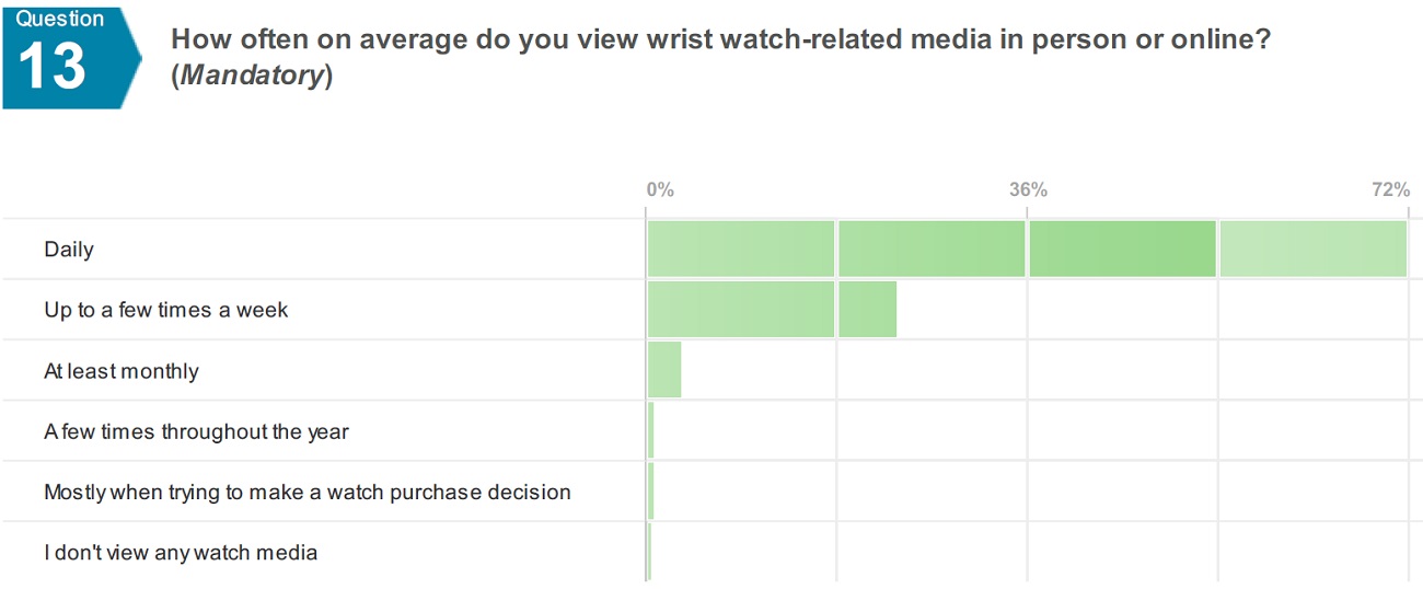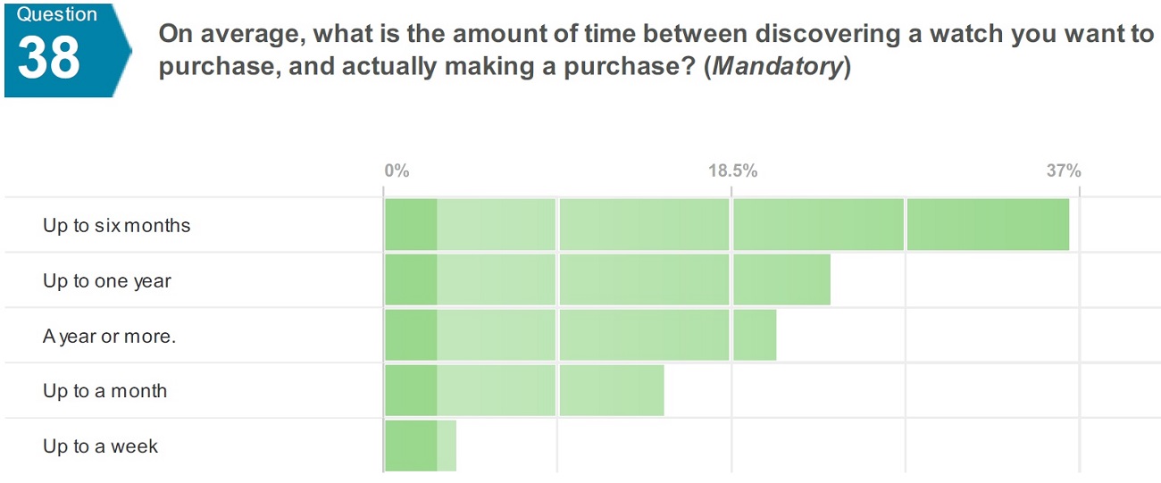 您還花費大量時間閱讀手表和查看評論。72% 的人每天觀看媒體,而 96% 的人至少每周向互聯網鐘表之神祈禱。幾乎沒有人在不做大量研究的情況下購買手表,而且考慮購買也需要時間。大多數手表愛好者需要 6-12 個月 (63%) 在您第一次對手表感興趣后做出購買手表的決定。46% 的人似乎更喜歡已經存在了一段時間的手表品牌,44% 的人對歷史悠久的和新成立的手表品牌同樣感興趣。