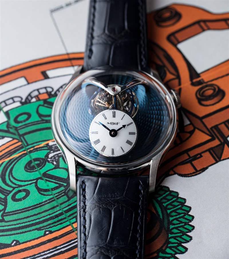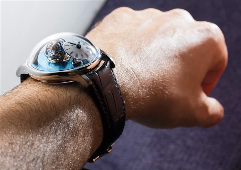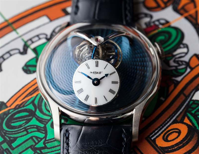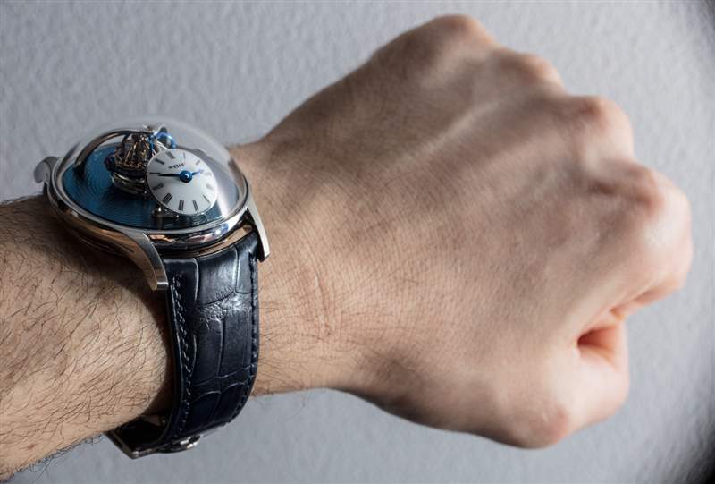 MB&F Legacy Machine Thunderdome 鉑金寬 44 毫米,體積大但非常耐磨。最大的視覺重量來自陡峭的圓頂外殼。那些對其可穿戴性持懷疑態度的人只需咨詢 MB&F 其他“高大”手表的許多滿意客戶即可。