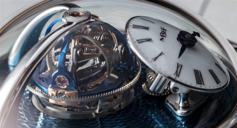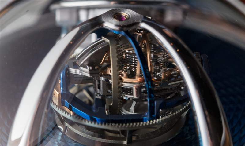 考慮到 TriAx 系統中所有部件的轉動速度有多快,這需要仔細檢查——你可以看到最里面的元件每 8 秒轉動一次,藍色的中間部分(我相信大部分 TriAx 是由鈦制成的)每 12 秒轉動一次, 最外面的籠子每 20 秒旋轉一次。TriAx 是一款非常迷人的小型鐘表陀螺,令人著迷。MB&F 未來可以通過在顯著的圓頂藍寶石水晶上開發更好的抗反射涂層來進一步改進 Thunderdome,從而提高這種非常易于觀看的手表機制的可見度。