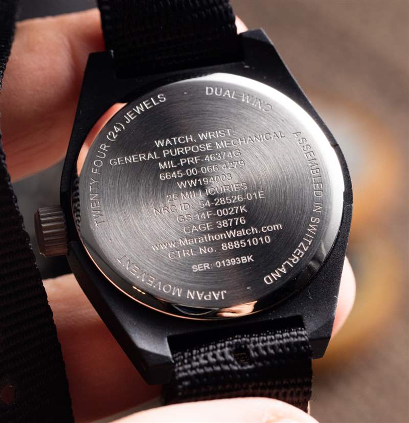 此版本 GPM 的表盤上方是一塊 3 毫米厚的扁平藍寶石水晶鏡面,這在這些價位上并不常見。外殼有一個金屬芯和一個黑色的“高強度纖維外殼”(其他顏色可供選擇)。這款手表的防水深度為 30 米,雖然不算多,但 Marathon 確實制造了更多防水型號——30 米似乎滿足了軍用規格要求。