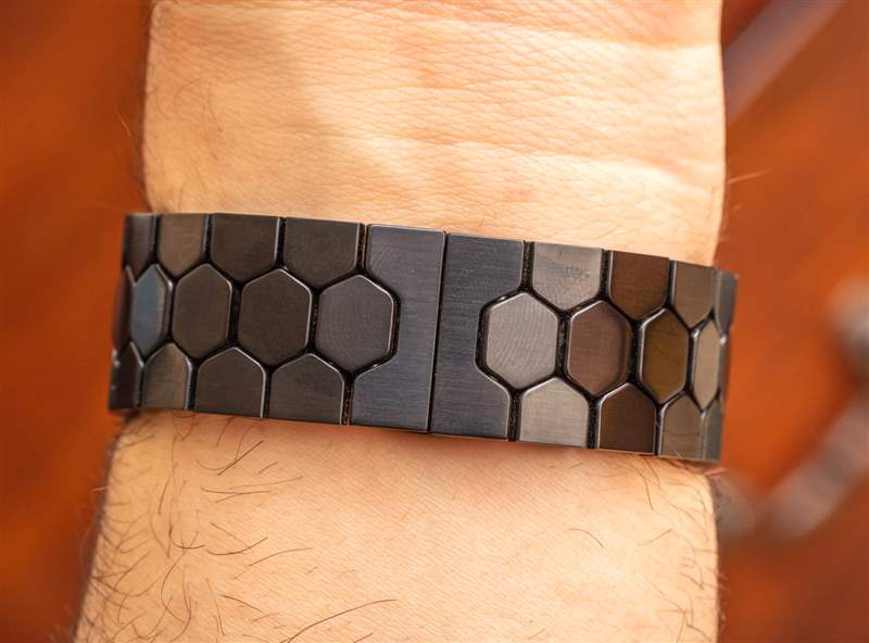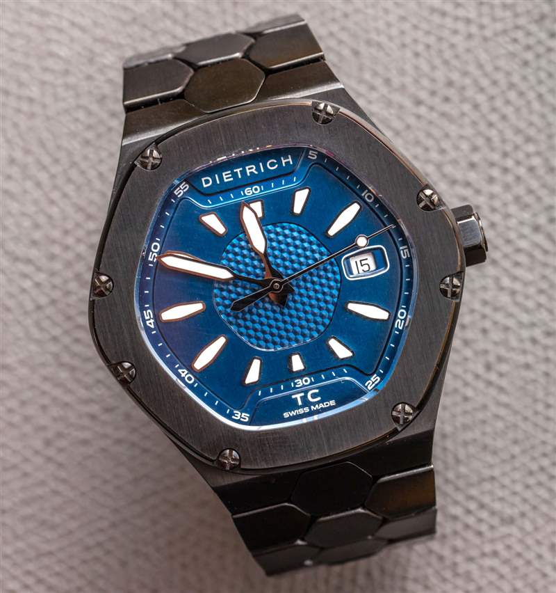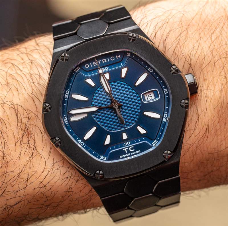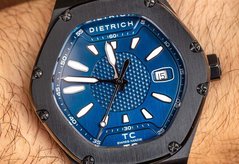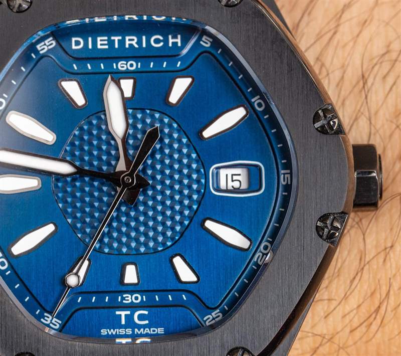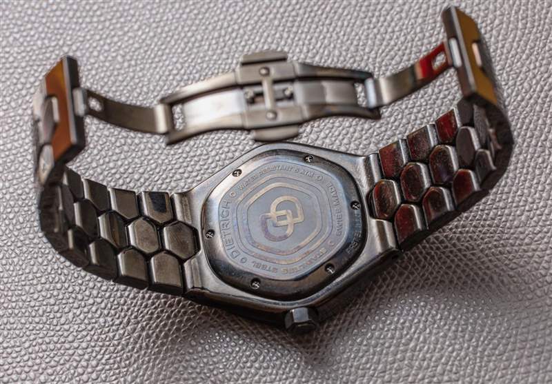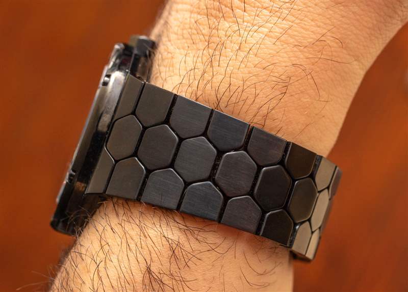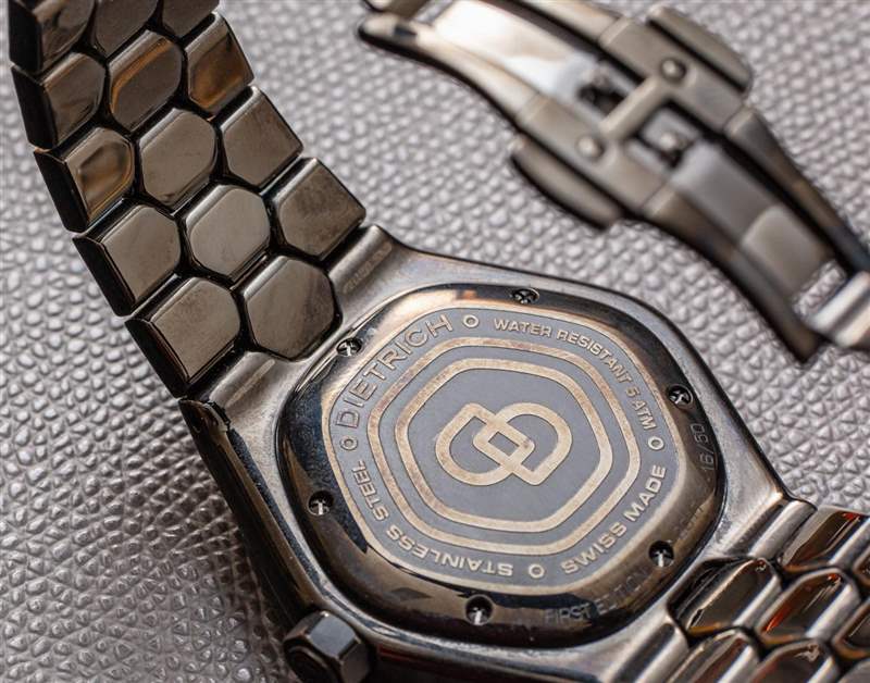 加上表冠,TC 鋼制表殼寬 46.2 毫米,沒有表冠,表殼寬 43.8 毫米,厚度僅為 9.3 毫米??紤]到與表殼的喇叭形側(cè)面相比,表耳變得狹窄,它實際上磨損了一點。在這里,我們看到迪特里希再次嘗試使用六邊形主題。這款腕表采用定制的藍寶石水晶表鏡和全鋼表殼和表鏈,重約 166 克,具??有 50 米防水深度和旋入式表冠。