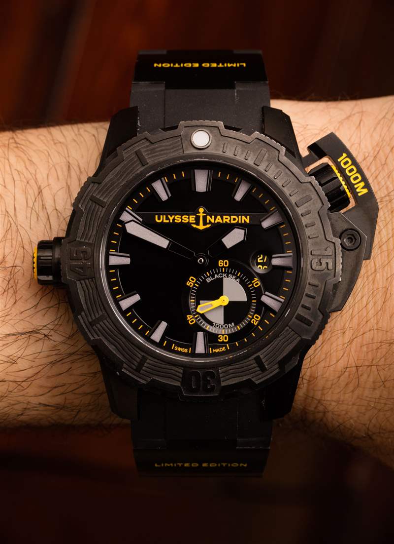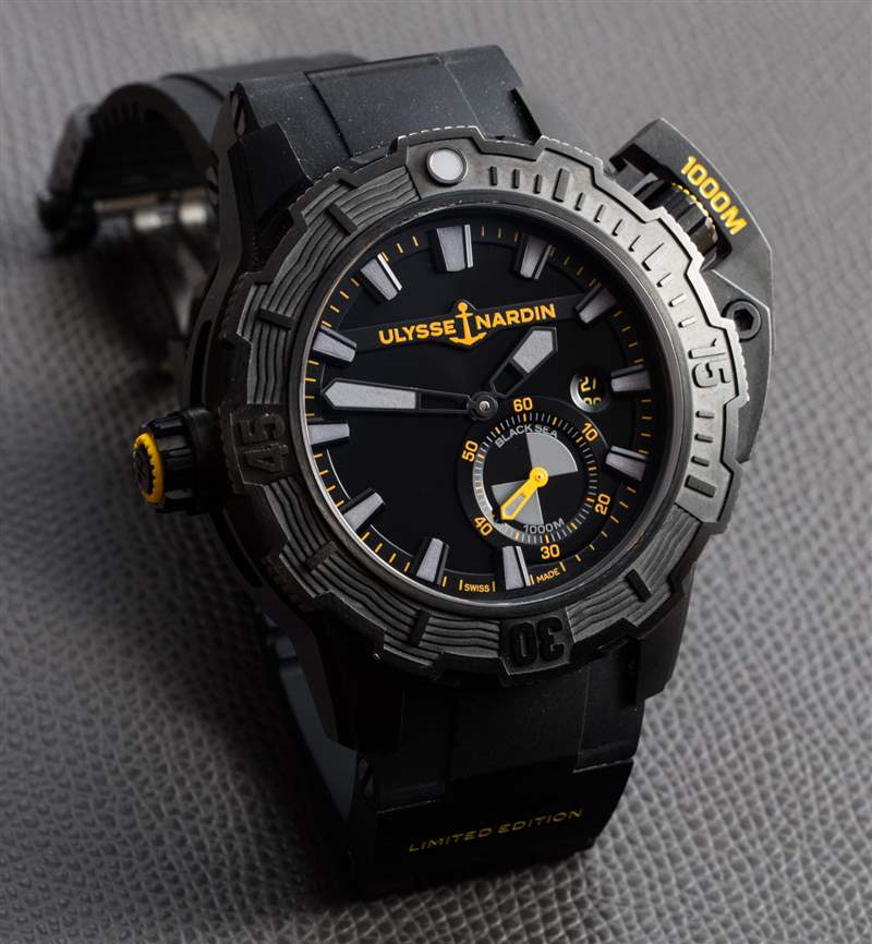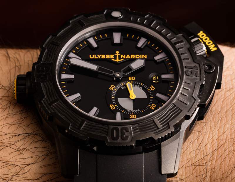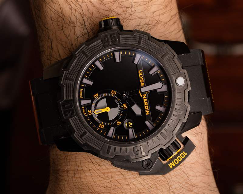 Diver Deep Dive (我知道,它的名稱中不需要有兩次“dive”)“One More Wave”是基于現有的Ulysse Nardin Diver Deep Dive 手表(此處為 aBlogtoWatch 動手操作)。我碰巧更喜歡這個黃色和黑色的版本。根據雅典表的說法,這款腕表必須是全黑的,并以主要為黑色的設計來慶祝這一點,并以灰色發光體和“緊急”黃色調為重點。外觀非常獨特,尤其是在人面前。觀看瑣事的粉絲們會很高興得知雅典和海豹突擊隊在顏色口音上來回多次——在球隊確定黃色之前,綠色、藍色和紅色等色調最終被拒絕。廣告訊息廣告信息結束