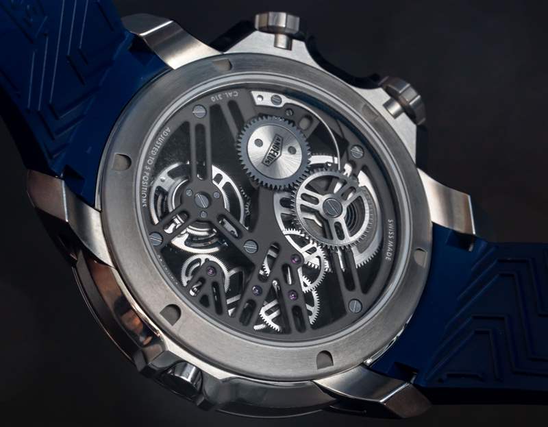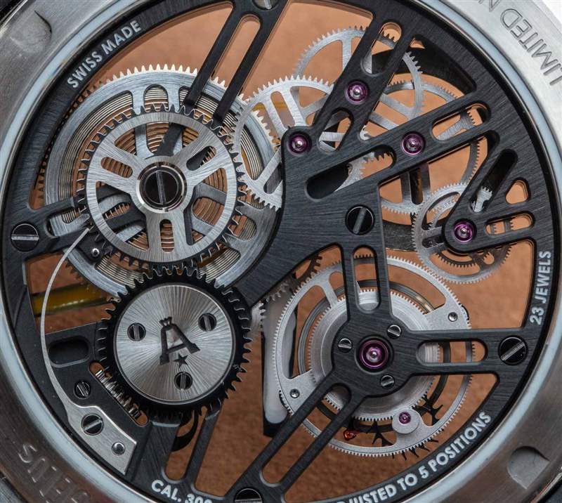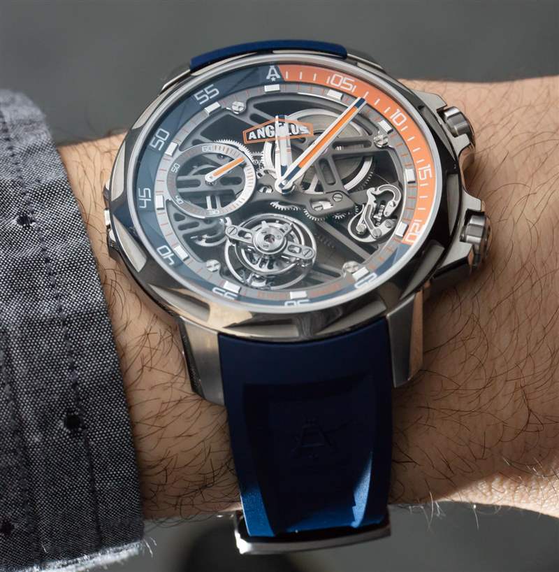 Angelus U51 Tourbillon Diver 也是內部生產的,包括鏤空和手動上鏈的 A-310 機芯,工作頻率為 4Hz,具有 5 天(120 小時)的良好動力儲備。有趣的是,它既有傳統(tǒng)的小秒盤,也有通過陀飛輪窗口顯示的秒針。該機芯在其他方面被設計為實用和纖薄,以及鏤空。重要功能包括用于增加可靠性的調節(jié)系統(tǒng)中的硅和用于增加耐用性的滾珠軸承式陀飛輪保持架。作為高級鐘表產品,當然有手工完成,但這不是 A. Lange & Sohne 的機芯。然而,它確實代表了我們在偉大的保守品牌中很少看到的思想開放和鼓舞人心的東西。