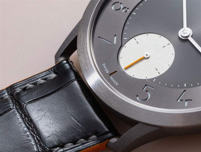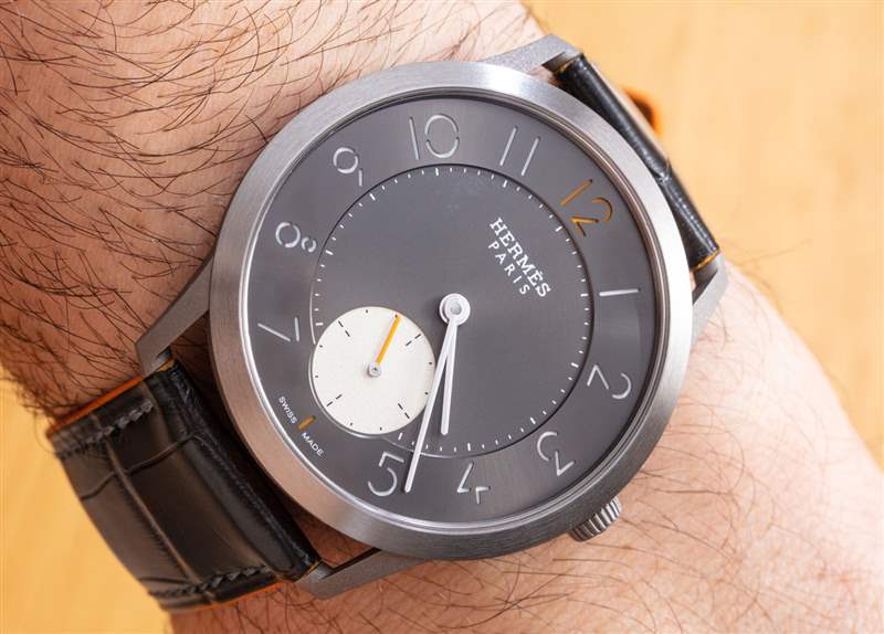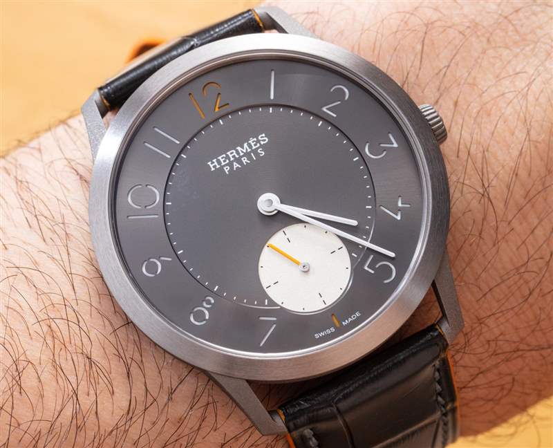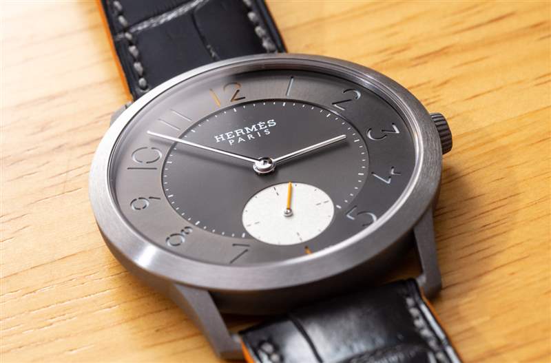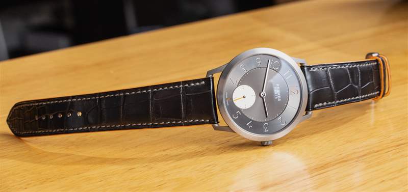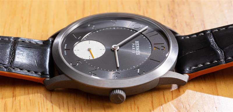 我個人一直在來回走動的是小秒盤的顏色。愛馬仕顯然希望 Slim Titane 更具運動感,所以我理解想要擁有一個高對比度的子表盤。也就是說,我覺得子表盤的顏色實際上太淺了,個人想看看它的顏色稍微深一點,即使它比表盤其余部分的無煙煤灰色更亮。