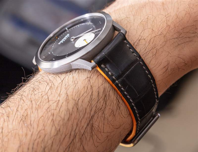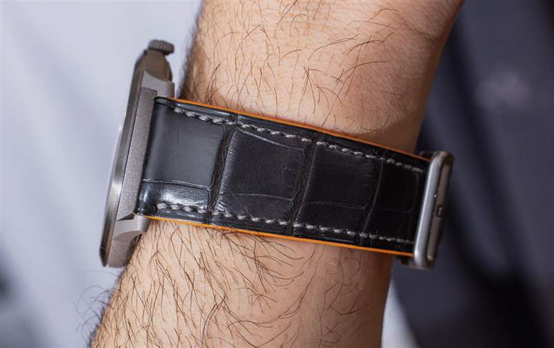 通過 Slim 獨特的表耳與表殼相連的是一條漂亮的愛馬仕鱷魚皮表帶。在這里,我們看到愛馬仕有點俏皮,但將品牌標志性的橙色隱藏在內部作為襯里,外部灰色鱷魚皮表帶。與表帶相連的是一個愛馬仕風格的鈦金屬搭扣。