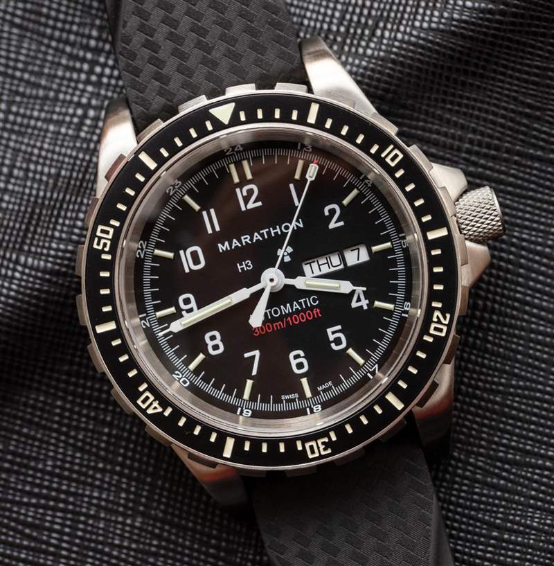 深表盤很簡單,但具有軍用手表所需的所有標記;易讀性很好。自發光氚氣管用于指針和時標,以實現完美的夜視,我喜歡將 24 小時時標放置在表盤周圍的法蘭環上,而不是占用寶貴的主表盤空間。鑒于表盤尺寸較大,星期/日期窗口并不會真正占用太多空間,即使它們確實會蠶食 3 點鐘的小時標記。我在這里要做的唯一改進是讓 Marathon 使用匹配的黑色日歷盤(而不是白色日歷盤),在表盤上具有高度對比度。