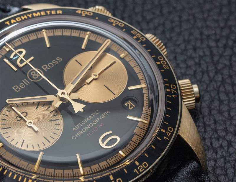 設計精美的Bellytanker Bronze 表盤帶有黑色和金色,帶有一絲紅色。金色的小表盤觸感很好,讓我想起某些永恒玫瑰金勞力士迪通拿手表型號的調色板。正如我上面所說,Bell & Ross 沒有選擇氧化青銅,而是選擇了一種穩定的青銅合金。這是一個重要的區別,因為幫助普及青銅作為現代手表材料的青銅合金,事實上,隨著時間的推移,“銅綠”。這款帶有青銅表殼(以及其他一些手表)的 Bell & Ross 選擇了一種不會氧化并隨后產生銅綠的金屬合金。當然,手表會刮花,但隨著時間的推移,它不會開始變綠或變黑。我更喜歡穩定的青銅,通常情況下,鑒于 BR V2-94 Bellytanker Bronze 的外觀更別致(而不是古董),