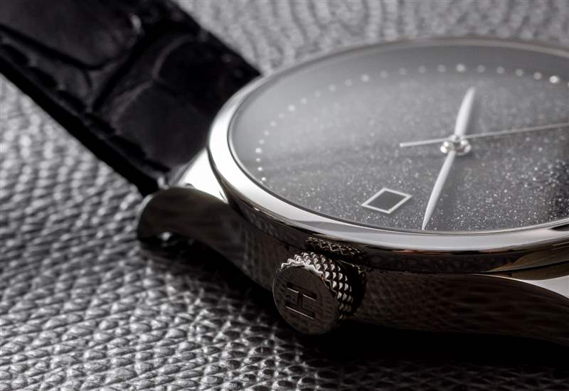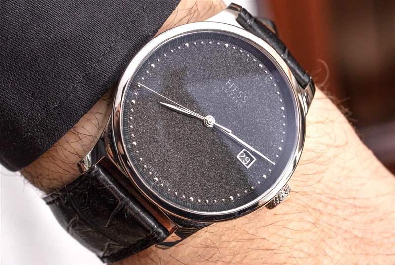 說到拋光和表面如何與光一起玩的問題,讓我們談談我最喜歡的 TWO.2 Diamond Dust 手表的部分,即表盤本身。鉆石粉塵表盤是使用特殊工藝生產的,其中實際的小鉆石顆粒通過某種粘合工藝附著在表盤上。然后,表盤具有閃亮的紋理,這絕不是壓倒性的,而是起到微妙的背景光澤。鉆石塵表盤是一種男性化的方式,可以在手腕上展現俏皮但正式的鐘表美感。鉆石塵表盤有一種獨特的慶祝元素,它不像手表上嚴格佩戴鉆石那么顯眼,而且比標準的黑色表盤更友好或更有趣。Hess 將其標志放在表盤上,具有諷刺意味的是,在鉆石灰塵的表面上很難看到它,