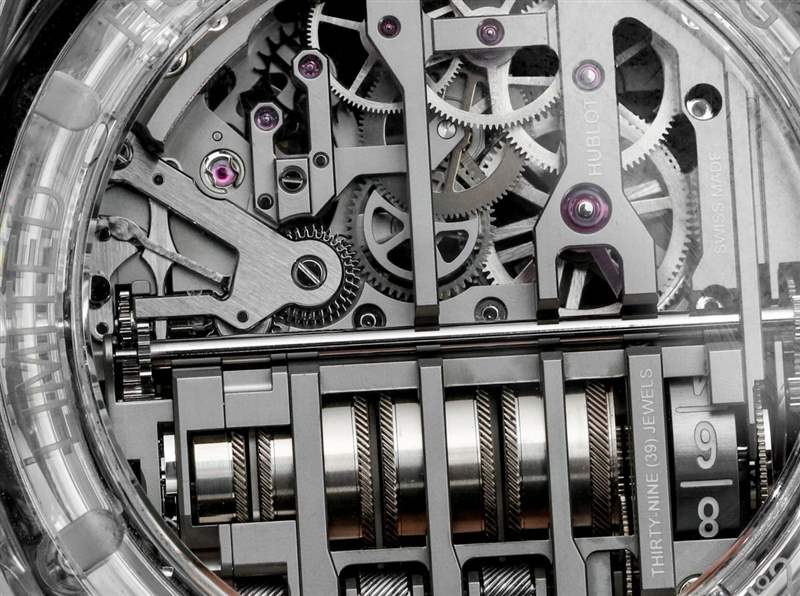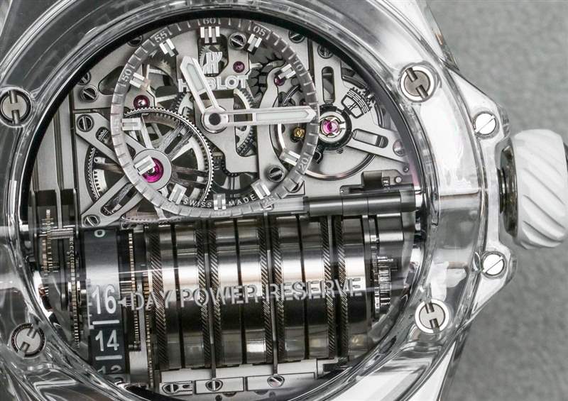 宇舶 MP-11 內部開發和生產的機芯是具有兩周動力儲存的 HUB9011 手動上鏈機芯。大約 336 小時的動力儲存來自總共七個耦合的主發條盒,您可以數數,因為它們水平堆疊并通過表盤可見。主發條盒的左側是一個額外的鼓,用作動力儲存指示器。我真的很佩服如果您閱讀動力儲存刻度上的當前數字(剩余天數)以及旁邊的文字,它會創建一個可以在您的腦海中閱讀的聲明(例如,“12 天動力儲存”)。主發條盒上方是一個偏心但清晰易讀的小時和分鐘顯示。